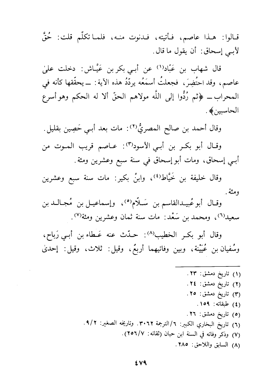 وَقَال أبو بكر بن أَبي الأسود (3) : عاصم قريب الموت من أبي إسحاق، ومات أبو إسحاق في سنة سبع وعشرين ومئة.