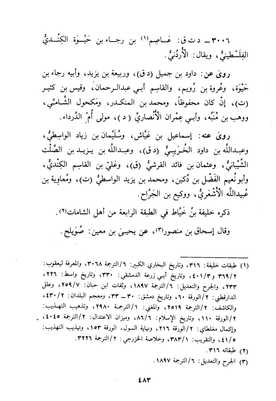3006 - د ت ق: عاصم بن رجاء بن حيوة الكندي الفلسطيني (1) ، ويُقال: الأردني.