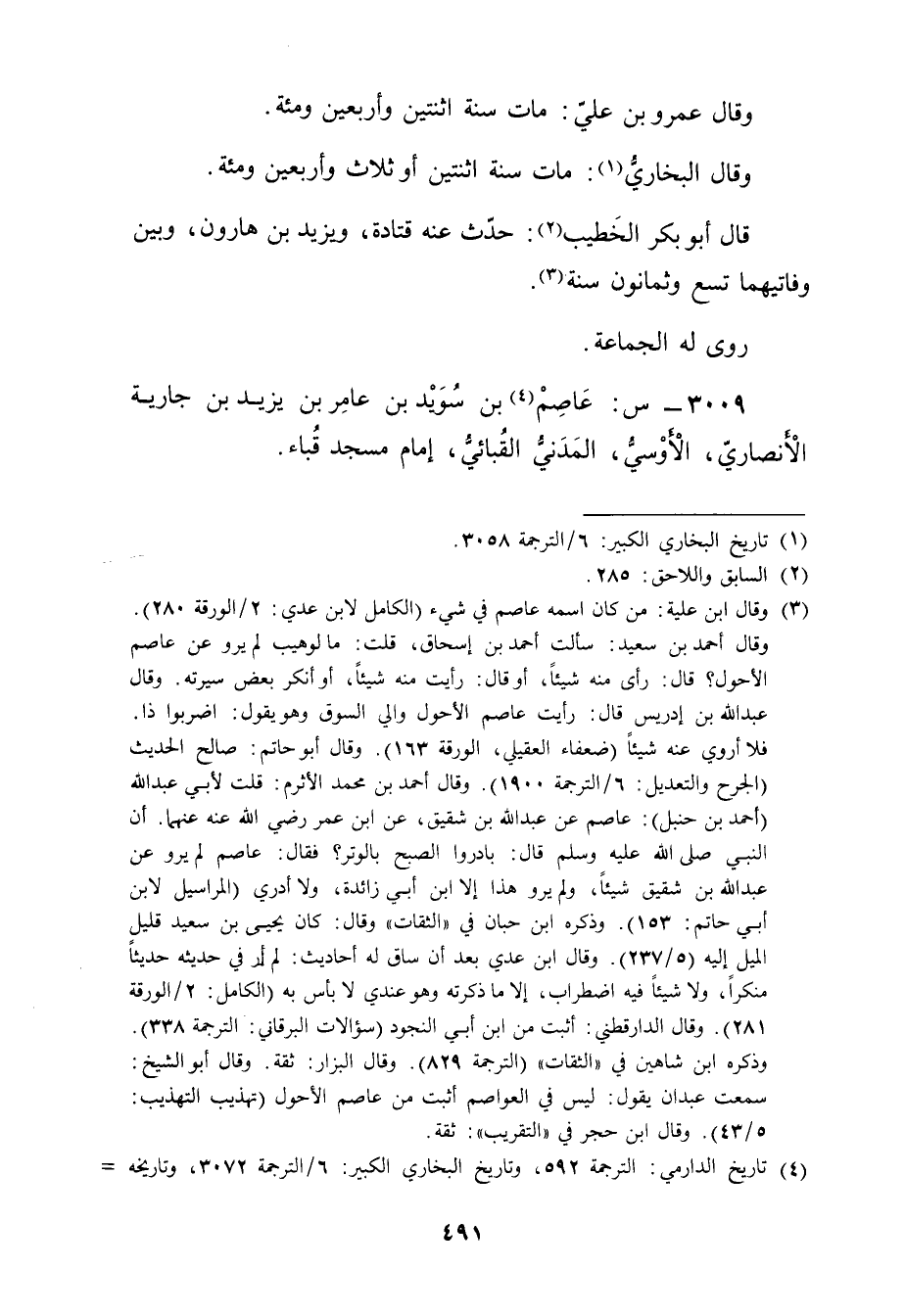 3009 - س: عاصم بن سويد بن عامر بْن يَزِيدَ بْن جارية الأَنْصارِيّ (4) ، الأوسي، المدني القبائي، إمام مسجد قباء.