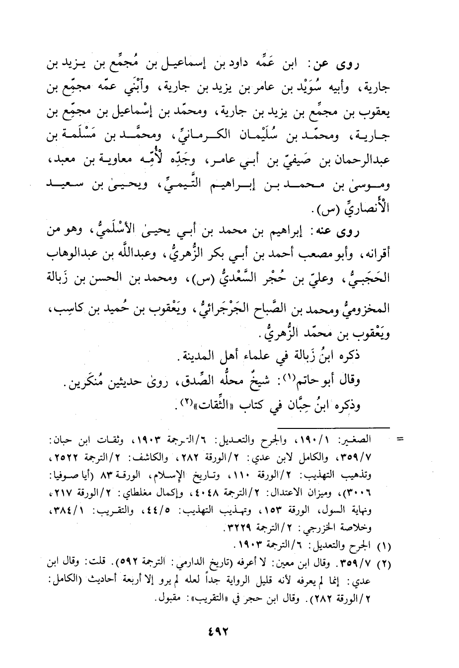 = الصغير: 1 / 190، والجرح والتعديل: 6 / الترجمة 1903، وثقات ابن حبان: 7 / 359، والكامل لابن عدي: 2 / الورقة 282، والكاشف: 2 / الترجمة 2522، وتذهيب التهذيب: 2 / الورقة 110، وتاريخ الاسلام، الورقة 83 (أيا صوفيا: 3006) ، وميزان الاعتدال: 2 / الترجمة 4048، وإكمال مغلطاي: 2 / الورقة 217، ونهاية السول، الورقة 153، وتهذيب التهذيب: 5 / 44، والتقريب: 1 / 384،