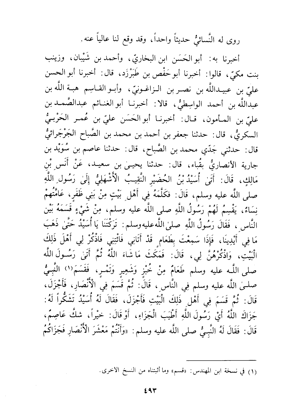 أخبرنا بِهِ: أَبُو الْحَسَنِ بْنُ الْبُخَارِيِّ، وأحمد بْن شَيْبَانَ، وزينب بِنْتُ مَكِّيٍّ، قَالُوا: أَخْبَرَنَا أَبُو حفص بن طَبَرْزَذَ، قال: أَخْبَرَنَا أَبُو الْحَسَن علي بْنُ عُبَيد اللَّهِ بْنِ نَصْرِ بْنِ الزَّاغُونِيِّ، وأَبُو الْقَاسِمِ هِبَةُ الله بْن عَبد الله بْن أَحْمَدَ الْوَاسِطِيُّ، قَالا: أَخْبَرَنَا أَبُو الْغَنَائِمِ عَبْدُ الصَّمَدِ بْنُ عَلِيِّ بْنِ الْمَأْمُونِ، قال: أَخْبَرَنَا أَبُو الْحَسَنِ عَلِيُّ بْنُ عُمَر الْحَرْبِيُّ السُّكَّرِيُّ، قال: حَدَّثَنَا جَعْفَرُ بْنُ أَحْمَدَ بْن مُحَمَّد بْن الصباح الْجُرْجَرَائِيُّ قال: حَدَّثَنِي جَدِّي مُحَمَّدُ بْنُ الصَّبَّاحِ، قال: حَدَّثَنَا عَاصِمُ بْنُ سُوَيْدِ بْنِ جَارِيَةَ الأَنْصارِيّ بِقَبَاءٍ، قال: حَدَّثَنَا يَحْيَى بْنُ سَعِيد، عَنْ أَنَسِ بْنِ مَالِكٍ، قال: أَتَى أُسَيْدُ بْنُ الْحُضَيْرِ النَّقِيبُ الأَشْهَلِيُّ إِلَى رَسُولِ اللَّهِ صلى الله عليه وسلم، قال: فَكَلَّمَهُ فِي أَهْلِ بَيْتٍ مِنْ بَنِي ظَفَرٍ، عَامَّتُهُمْ نِسَاءٌ، يَقْسِمُ لهم رسول الله صلى الله عَلَيْهِ وسَلَّمَ، مِنْ شَيْءٍ قَسَمَهُ بَيْنَ النَّاسِ، فَقَالَ رَسُولُ اللَّهِ صَلَّى اللَّهُ عَلَيْهِ وسَلَّمَ: تَرَكْتَنَا يَا أُسَيْدُ حَتَّى ذَهَبَ مَا فِي أَيْدِينَا، فَإِذَا سَمِعْتَ بِطَعَامٍ قَدْ أَتَانِي فَائْتِنِي فَاذْكُرْ لِي أَهْلَ ذَلِكَ الْبَيْتِ، واذْكُرْهُنَّ لِي، قلاال: فَمَكَثَ مَا شَاءَ اللَّهُ ثُمَّ أَتَى رَسُولَ اللَّهِ صلى الله عَلَيْهِ وسَلَّمَ طَعَامٌ مِنْ خُبْزٍ وشَعِيرٍ وتَمْرٍ، فَقَسَمَ (1) النَّبِيُّ صَلَّى الله عليه وسلم في النسا، قال: ثُمَّ قَسَمَ فِي الأَنْصَارِ، فَأَجْزَلَ، قال: ثُمَّ قَسَمَ فِي أَهْلِ ذَلِكَ الْبَيْتِ فَأَجْزَلَ، فَقَالَ لَهُ أُسَيْدٌ تَشَكُّرًا لَهُ: جَزَاكَ اللَّهُ أَيْ رَسُولَ اللَّهِ أَطْيَبَ الْجَزَاءِ، أَوْ قال: خَيْرًا، شَكَّ عَاصِمٌ، قال: فَقَالَ لَهُ النَّبِيُّ صَلَّى اللَّهُ عَلَيْهِ وسَلَّمَ: وأَنْتُمْ معشر الانصار فجزاكم