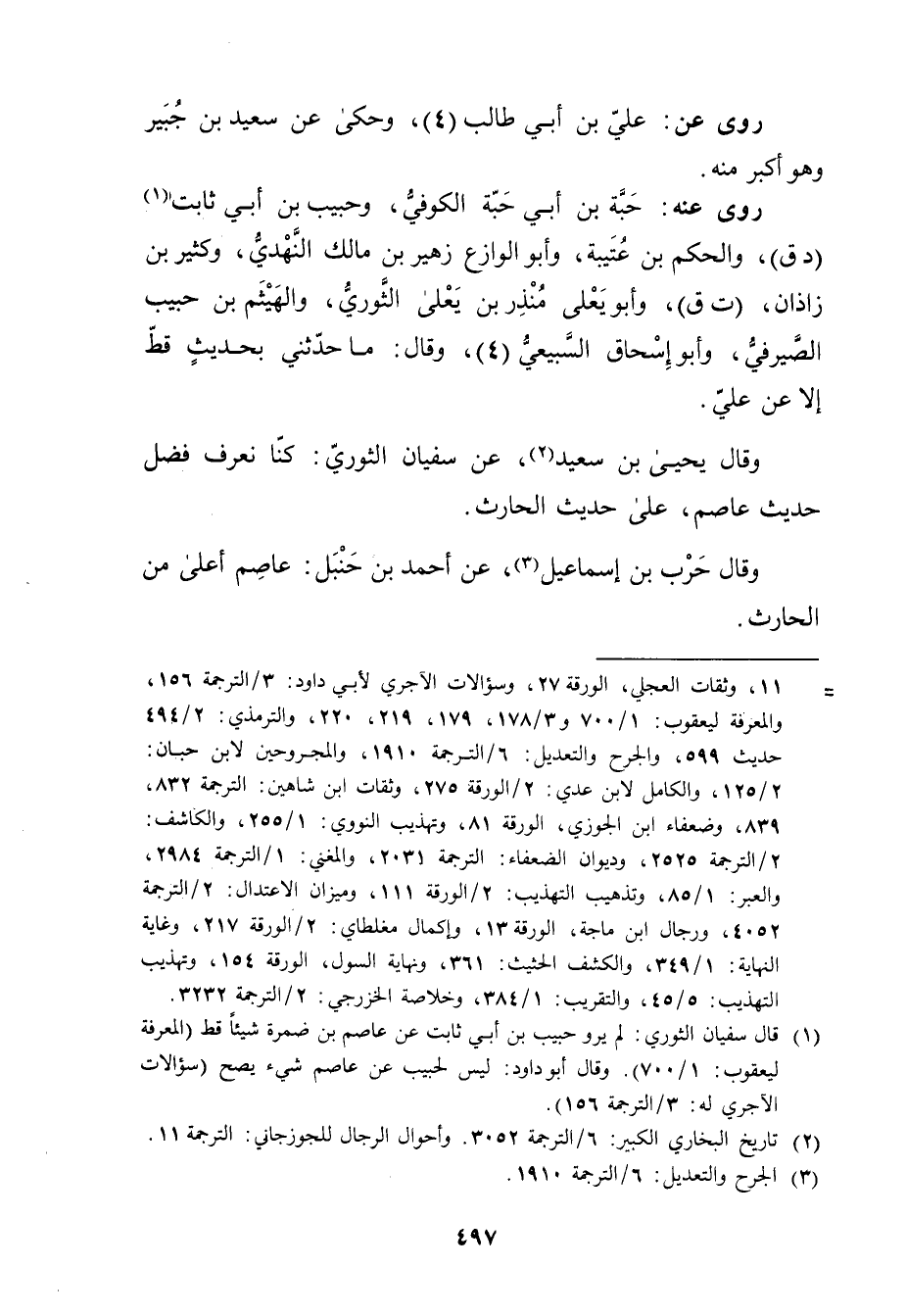 (1) قال سفيان الثوري: لم يرو حبيب بن أَبي ثابت عن عاصم بن ضمرة شيئا قط (المعرفة ليعقوب: 1 / 700) . وَقَال أبو داود: ليس لحبيب عن عاصم شيء يصح (سؤالات الآجري له: 3 / الترجمة 156) .