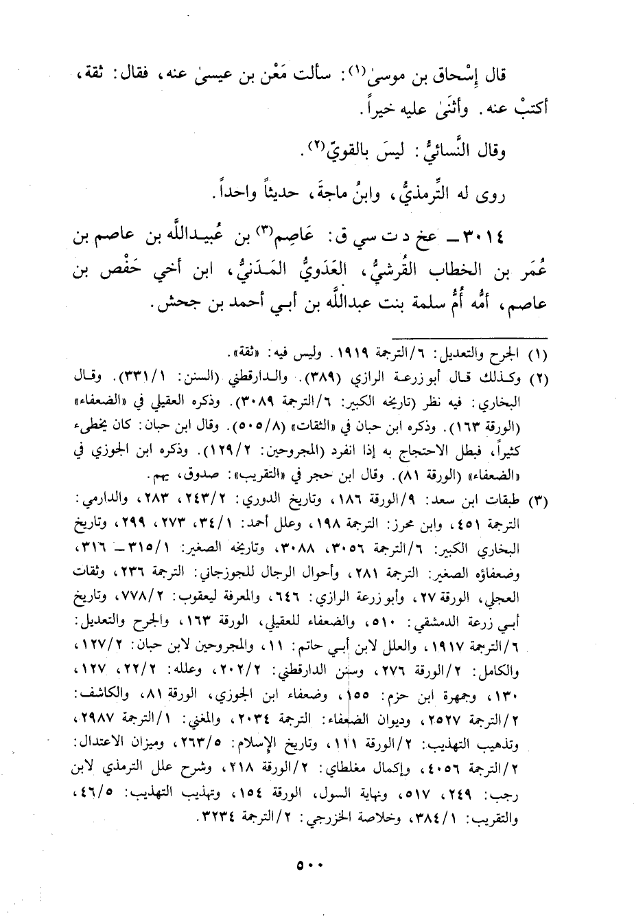 (3) طبقات ابن سعد: 9 / الورقة 186، وتاريخ الدوري: 2 / 243، 283، والدارمي: الترجمة 451، وابن محرز: الترجمة 198، وعلل أحمد: 1 / 34، 273، 299، وتاريخ البخاري الكبير: 6 / الترجمة 3056، 3088، وتاريخه الصغير: 1 / 315 - 316، وضعفاؤه الصغير: الترجمة 281، وأحوال الرجال للجوزجاني: الترجمة 236، وثقات العجلي، الورقة 27، وأبو زُرْعَة الرازي: 646، والمعرفة ليعقوب: 2 / 778، وتاريخ أبي زرعة الدمشقي: 510، والضعفاء للعقيلي، الورقة 163، والجرح والتعديل: 6 / الترجمة 1917، والعلل لابن أَبي حاتم: 11، والمجروحين لابن حبان: 2 / 127، والكامل: 2 / الورقة 276، وسنن الدارقطني: 2 / 202، وعلله: 2 / 22، 127، 130، وجمهرة ابن حزم: 155، وضعفاء ابن الجوزي، الورقة 81، والكاشف: 2 / الترجمة 2527، وديوان الضعفاء: الترجمة 2034، والمغني: 1 / الترجمة 2987، وتذهيب التهذيب: 2 / الورقة 111، وتاريخ الاسلام: 5 / 263، وميزان الاعتدال: 2 / الترجمة 4056، وإكمال مغلطاي: 2 / الورقة 218، وشرح علل التِّرْمِذِيّ لابن