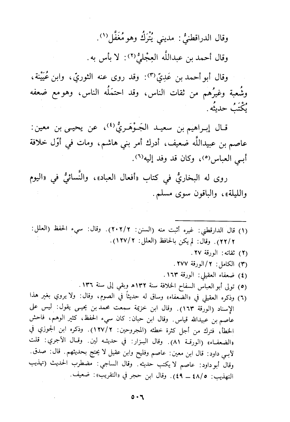 (6) وذكره العقيلي في "الضعفاء"وساق له حديثًا في الصوم، وَقَال: ولا يروي بغير هذا الإسناد (الورقة 163) وَقَال ابن خزيمة سمعت مُحَمَّد بْن يَحْيَى يقول: ليس على عاصم بن عُبَيد الله قياس. وَقَال ابن حبان: كان سئ الحفظ، كثير الوهم، فاحش الخطأ، فترك من أجل كثرة خطئه (المجروحين: 2 / 127) ، وذَكَره ابن الجوزي في "الضعفاء" (الورقة 81) .