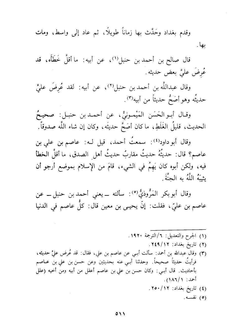 (3) وَقَال عَبد اللَّهِ بْن أحمد: سَأَلتُ أبي عن عاصم بن علي، فقال: قد عرض علي حديثه، فرأيت حديثًا صحيحا. وحَدَّثَنَا أبي عنه بحديثين وعن حسن بن علي بن عاصم بأحاديث. قال أبي: وكان حسن بن علي بن عاصم أعقل من ابيه ومن أخيه (علل أحمد: 1 / 186) .