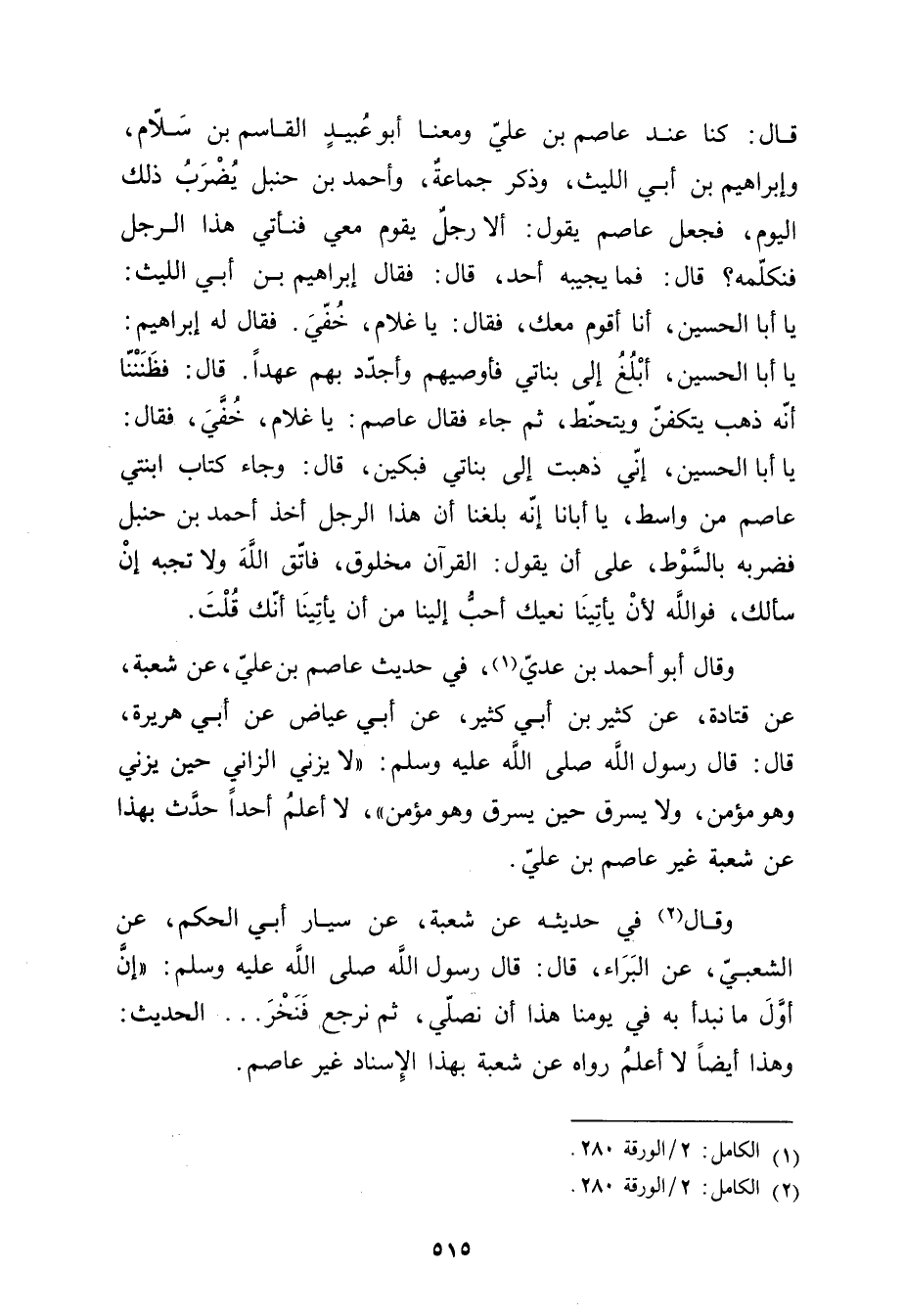 وَقَال أبو أحمد بن عدي (1) ، في حديث عاصم بن علي، عن شعبة، عن قتادة، عن كثير بن أَبي كثير، عَن أبي عياض عَن أَبِي هُرَيْرة، قال: قال رَسُولُ اللَّهِ صلى الله عليه وسلم: لا يزني الزاني حين يزني وهو مؤمن، ولا يسرق حين يسرق وهو مؤمن"، لا أعلم أحدا حدث بهذا عن شعبة غير عاصم بن علي.