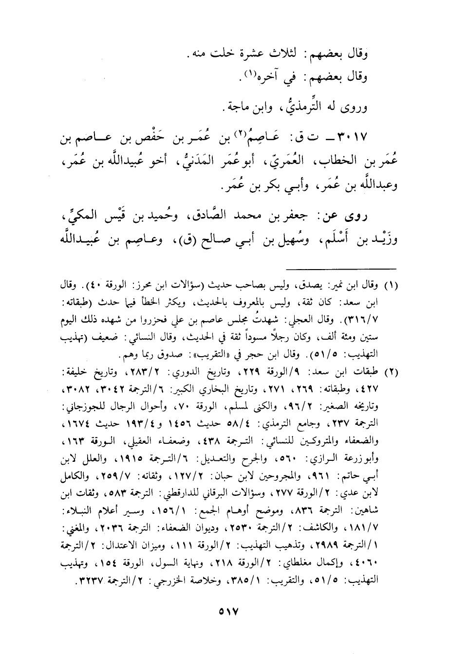 3017 - ت ق: عاصم بن عُمَر بْن حَفْص بْن عاصم بْن عُمَر بن الخطاب (2) ، العُمَري، أبو عُمَر المدني، أخو عُبَيد الله بْن عُمَر، وعبد اللَّه بْن عُمَر، وأبي بكر بن عُمَر.