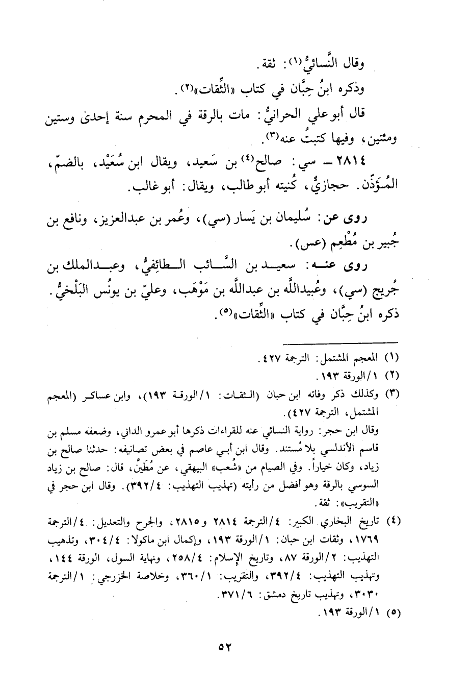 (3) وكذلك ذكر وفاته ابن حبان (الثقات: 1 / الورقة 193) ، وابن عساكر (المعجم المشتمل، الترجمة 427) . وَقَال ابن حجر: رواية النَّسَائي عنه للقراءات ذكرها أبو عَمْرو الداني، وضعفه مسلم بن قاسم الاندلسي بلا مستند. وَقَال ابن أَبي عاصم في بعض تصانيفه: حَدَّثَنَا صالح بن زياد، وكان خيارا. وفي الصيام من"شعب"البيهقي، عن مطين، قال: صالح بن زياد السوسي بالرقة وهو أفضل من رأيته (تهذيب التهذيب: 4 / 392) . وَقَال ابن حجر في "التقريب": ثقة.