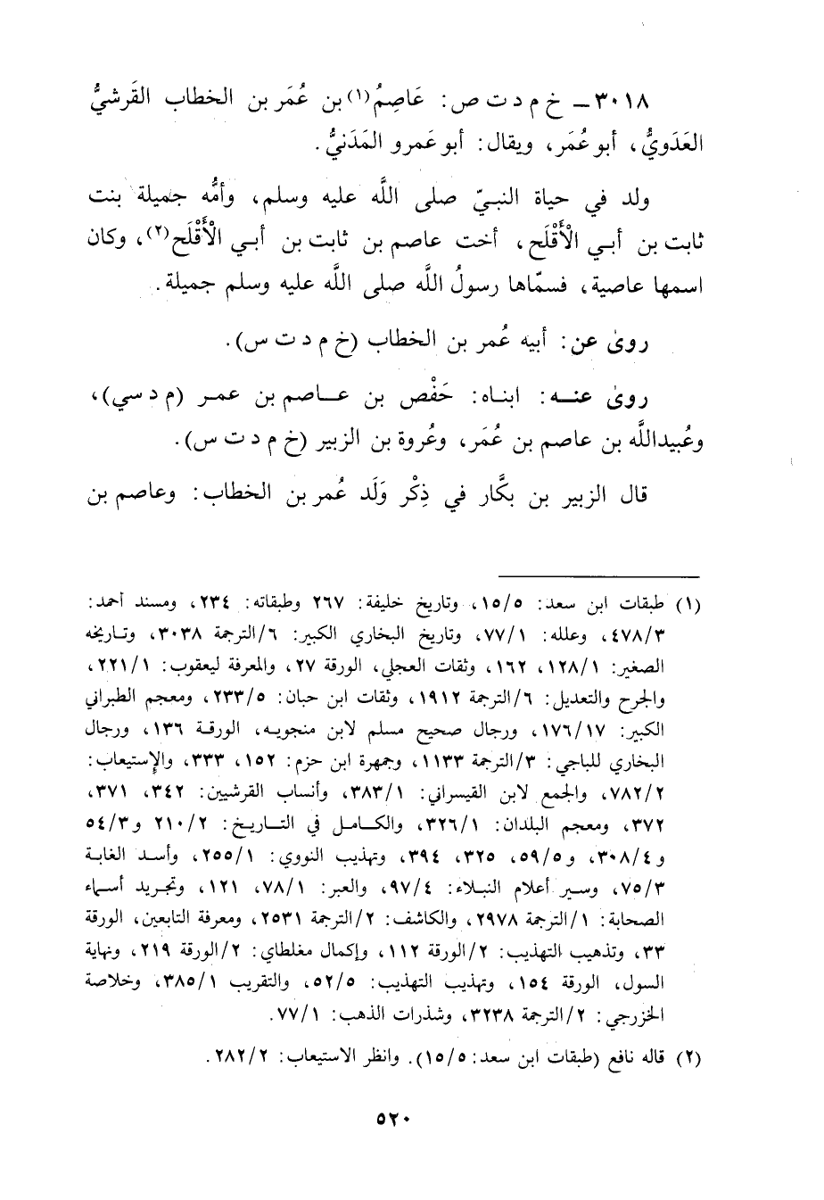 3018 - خ م د ت ص: عاصم بْن عُمَر بْن الخطاب الْقُرَشِيّ العدوي (1) ، أَبُو عُمَر، ويُقال: أبو عَمْرو المدني.