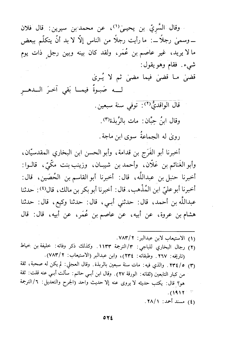 أَخْبَرَنَا أَبُو الفرج بْن قدامة، وأبو الْحَسَن بْن الْبُخَارِيّ المقدسيان، وأَبُو الغنائم بْن علان، وأحمد بْن شيبان، وزَيْنَبُ بِنْتُ مَكِّيٍّ، قَالُوا: أَخْبَرَنَا حنبل بْن عَبد الله، قال: أَخْبَرَنَا أبو القاسم بْن الحصين، قال: أَخْبَرَنَا أَبُو عَلِيِّ ابْنُ الْمُذْهِب، قال: أَخْبَرَنَا أبو بكر بْن مالك، قال (4) : حَدَّثَنَا عَبد اللَّهِ بْن أَحْمَدَ، قال: حَدَّثني أَبِي، قال: حَدَّثَنَا وكِيعٌ، قال: حَدَّثَنَا هِشَامُ بْنُ عُرْوَةَ، عَن أَبِيهِ، عَنْ عَاصِمِ بْنِ عُمَر، عَن أبيه، قال: قال
