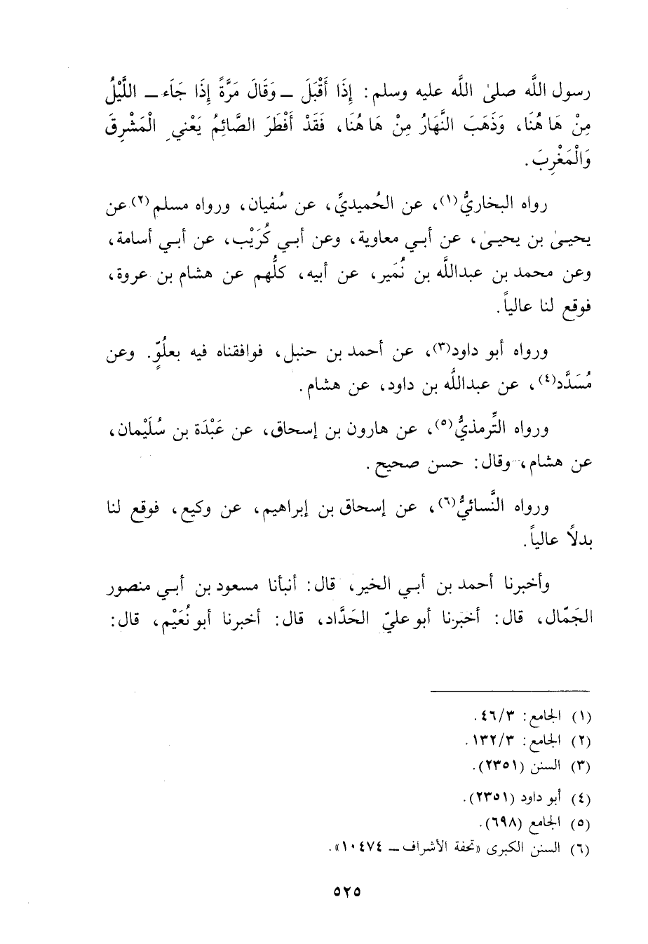 رَوَاهُ الْبُخَارِيُّ (1) ، عَنِ الْحُمَيْدِيِّ، عَنْ سُفْيَانَ، ورَوَاهُ مُسْلِمٍ (2) عَنْ يَحْيَى بْنِ يَحْيَى، عَن أَبِي مُعَاوِيَةَ، وعَن أَبِي كُرَيْبٍ، عَن أَبِي أُسَامَةَ، وعَنْ مُحَمَّدِ بْنِ عَبد اللَّهِ بْنِ نُمَيْرٍ، عَن أَبِيهِ، كلهم عَنْ هشام بْن عروة، فَوَقَعَ لَنَا عَالِيًا.