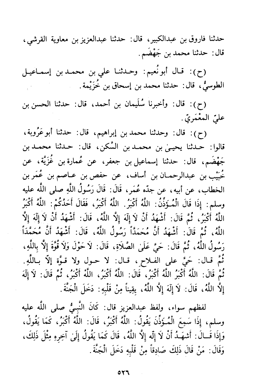 (ح) : قال: وحَدَّثَنَا مُحَمَّدُ بْنُ إِبْرَاهِيمَ، قال: حَدَّثَنَا أَبُو عَرُوبَة، قَالُوا: حَدَّثَنَا يَحْيَى بْن مُحَمَّدِ بْن السكن، قال: حَدَّثَنَا مُحَمَّدُ بْنُ جَهْضَمٍ، قال: حَدَّثَنَا إِسْمَاعِيلُ بْنُ جَعْفَرٍ، عَنْ عُمَارَةَ بْنِ غُزَيَّةَ، عَنْ خَبِيبِ بْنِ عَبْدِ الرَّحْمَنِ بْنِ أَسَافٍ، عن حفص بْن عاصم بْن عُمَر بن الخطاب، عَن أبيه، عَنْ جَدِّهِ عُمَر، قال: قال رَسُول اللَّهِ صلى الله عليه وسَلَّمَ: إِذَا قال الْمُؤَذِّنُ: اللَّهُ أَكْبَرُ. اللَّهُ أَكْبَرُ، فَقَالَ أَحَدُكُمْ: اللَّهُ أَكْبَرُ اللَّهُ أَكْبَرُ، ثُمَّ قال: أشهد أن لا إله إِلا اللَّهُ، قال: أَشْهَدُ أَنْ لا إله إلا الله، ثم قال: أَشْهَدُ أَنَّ مُحَمَّدًا رَسُولُ اللَّهِ، قال: أَشْهَدُ أَنَّ مُحَمَّدًا رَسُولُ اللَّهِ، ثُمَّ قال: حَيَّ عَلَى الصَّلاةِ، قال: لا حَوْلَ ولا قُوَّةَ إِلا بِاللَّهِ. ثُمَّ قال: اللَّهُ أَكْبَرُ اللَّهُ أَكْبَرُ، قال: اللَّهُ أَكْبَرُ، اللَّهُ أَكْبَرُ، ثم قال: لا إله إلا اللَّهُ، قال: لا إِلَهَ إِلا اللَّهُ، يَقِينًا مِنْ قَلْبِهِ: دَخَلَ الْجَنَّةَ.