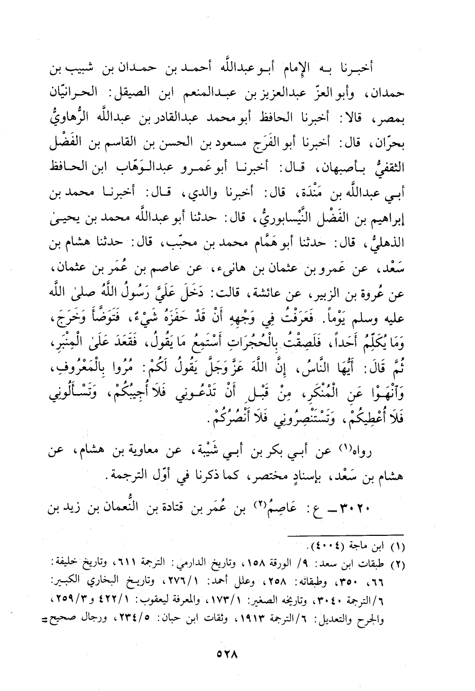 أَخْبَرَنَا بِهِ الإِمَامُ أَبُو عَبْدِ اللَّهِ أَحْمَدُ بْنُ حَمْدَانَ بْنِ شَبِيبِ بْنِ حَمْدَانَ، وأَبُو الْعِزِّ عَبْد الْعَزِيزِ بْن عبد المنعم ابن الصَّيْقَلِ الْحَرَانِيَّانِ بِمِصْرَ، قَالا: أَخْبَرَنَا الْحَافِظُ أَبُو مُحَمَّدٍ عَبْدُ الْقَادِرِ بْنُ عَبد اللَّهِ الرُّهَاوِيُّ بِحَرَّانَ، قال: أَخْبَرَنَا أَبِوُ الْفَرَجِ مَسْعُودُ بْن الْحَسَن بْن الْقَاسِم بْن الْفَضْلِ الثَّقَفِيُّ بِأَصْبَهَانَ، قال: أَخْبَرَنَا أبو عَمْرو عبد الوهاب ابن الْحَافِظُ أَبِي عَبد اللَّهِ بْنِ مَنْدَهْ، قال: أَخْبَرَنَا والِدِي، قال: أخبرنا مُحَمَّدُ بْنُ إِبْرَاهِيمَ بْنِ الْفَضْلِ النَّيْسَابُورِيُّ، قال: حَدَّثَنَا أَبُو عَبْد اللَّهِ مُحَمَّد بْن يحيى الذهلي، قال: حَدَّثَنَا أَبُو هَمَّامٍ مُحَمَّدُ بْنُ مُحَبَّبٍ، قال: حَدَّثَنَا هِشَامُ بن سعد، عن عَمْرو بن عُثْمَانَ بْنِ هَانِئٍ، عَنْ عَاصِمِ بْنِ عُمَر بْنِ عُثْمَانَ، عَنْ عُرْوَةَ بْنِ الزُّبَيْرِ، عَنْ عَائِشَةَ، قَالَتْ: دَخَلَ عَلِيَّ رَسُولُ اللَّهِ صَلَّى اللَّهُ عَلَيْهِ وسَلَّمَ يَوْمًا. فَعَرَفَتُ فِي وجْهِهِ أَنْ قَدْ حَفَزَهُ شَيْءٌ، فَتَوَضَأَّ وخَرَجَ، ومَا يتكلم أَحَدًا، فَلَصِقْتُ بِالْحُجُرَاتِ أَسْتَمِعُ مَا يَقُولُ، فَقَعَدَ عَلَى الْمِنْبَرِ، ثُمَّ قال: أَيُّهَا النَّاسُ، إِنَّ اللَّهَ عزوجل يَقُولُ لَكُمْ: مُرُوا بِالْمَعْرُوفِ، وانْهَوْا عَنِ الْمُنْكَرِ، مِنْ قَبْلِ أَنْ تَدْعُونِي فَلا أُجِيبُكُمْ، وتَسْأَلُونِي فَلا أُعْطِيكُمْ، وتَسْتَنْصُرُونِي فَلا أَنْصُرُكُمْ.