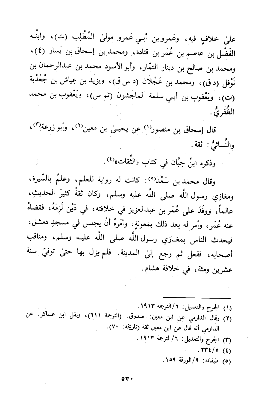 وَقَال محمد بن سعد (5) : كانت له رواية للعلم، وعلم بالسيرة، ومغازي رسول الله صَلَّى اللَّهُ عَلَيْهِ وسَلَّمَ، وكان ثقة كثير الحديث،