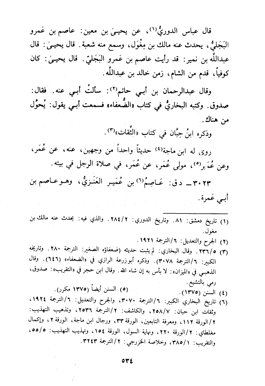 (6) تاريخ البخاري الكبير: 6 / الترجمة 3070، والجرح والتعديل: 6 / الترجمة 1924، وثقات ابن حبان: 7 / 258، والكاشف: 2 / الترجمة 2536، وتذهيب التهذيب: 2 / الورقة 112، ومعرفة التابعين، الورقة 33، ورجال ابن ماجة، الورقة 2، وإكمال مغلطاي: 2 / الورقة 220، ونهاية السول، الورقة 154، وتهذيب التهذيب: 5 / 55، والتقريب: 1 / 385، وخلاصة الخزرجي: 2 / الترجمة 3243.