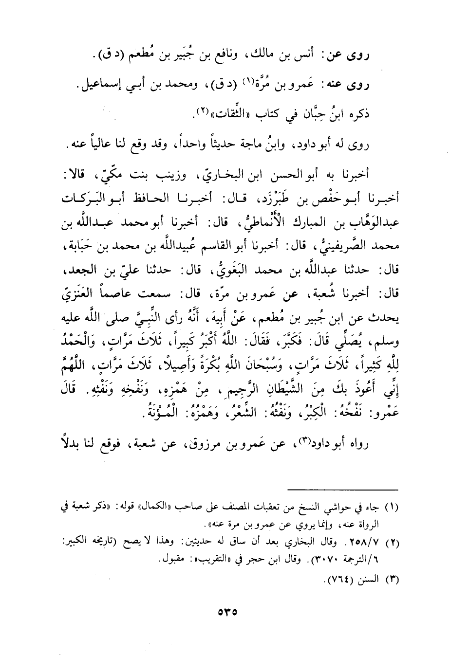 أَخْبَرَنَا بِهِ أَبُو الحسن بْن البخاري، وزينب بنت مكي، قَالا: أخبرنا أَبُو حفص بن طَبَرْزَذَ، قال: أخبرنا الْحَافِظُ أَبُو الْبَرَكَاتِ عَبْدُ الوَّهَّابِ بْنُ الْمُبَارَكِ الأَنْمَاطِيُّ، قال: أَخْبَرَنَا أبو مُحَمَّد عَبد الله بْن مُحَمَّد الصريفيني، قال: أَخْبَرَنَا أبو القاسم عُبَيد الله بْن مُحَمَّد بْن حبابة، قال: حَدَّثَنَا عَبد اللَّهِ بْن مُحَمَّد البغوي، قال: حَدَّثَنَا علي بْن الْجَعْدِ، قال: أَخْبَرَنَا شُعْبَةُ، عَنْ عَمْرو بْنِ مُرَّةَ، قال: سَمِعْتُ عَاصِمًا الْعَنَزِيَّ يُحَدِّثُ عَنِ ابْنِ جبير بْن مطعم، عَن أَبِيهِ، إنه رأى النبي صَلَّى اللَّهُ عَلَيْهِ وسَلَّمَ، يُصَلِّي قال: فَكَبَّرَ، فَقَالَ: اللَّهُ أَكْبَرُ كَبِيرًا، ثَلاثَ مَرَّاتٍ، والْحَمْدُ لِلَّهِ كَثِيرًا، ثَلاثَ مَرَّاتٍ، وسُبْحَانَ اللَّهُ بُكْرَةً وأَصِيلا، ثَلاثَ مَرَّاتٍ، اللَّهُمَّ إِنِّي أَعُوذُ بِكَ مِنَ الشَّيْطَانِ الرَّجِيمِ، مِنْ هَمْزِهِ، ونَفْخِهِ ونَفْثِهِ. قال عَمْرو: نَفْخُهُ: الْكِبْرُ، ونَفْثُهُ: الشِّعْرُ، وهَمْزُهُ: الْمُؤْنَةُ.