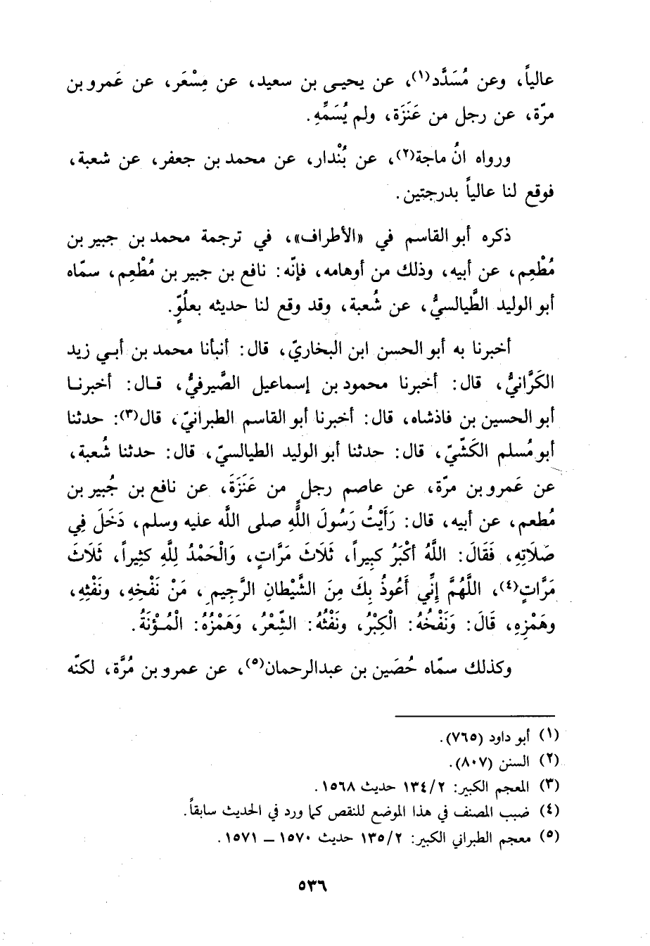 أخبرنا به أَبُو الْحَسَنِ بْنُ الْبُخَارِيِّ، قال: أَنْبَأَنَا مُحَمَّدِ بْنِ أَبي زَيْدٍ الْكَرَّانِيِّ، قال: أَخْبَرَنَا مَحْمُودُ بْنُ إِسْمَاعِيلَ الصَّيْرَفِيُّ، قال: أخبرنا أَبُو الْحُسَيْنِ بْنِ فَاذْشْاهِ، قال: أخبرنا أَبُو الْقَاسِمِ الطَّبَرَانِيُّ، قال (3) : حَدَّثَنَا أَبُو مُسْلِمٍ الْكَشِّيُّ، قال: حَدَّثَنَا أَبُو الْوَلِيدِ الطَّيَالِسِيُّ، قال: حَدَّثَنَا شُعْبَةُ، عَنْ عَمْرو بْن مرة، عَنْ عَاصِمٍ رَجُلٍ مِنْ عَنْزَةَ، عَنْ نافع بْن جبير بْن مطعم، عَن أَبِيهِ، قال: رَأَيْتُ رَسُولَ اللَّهِ صلى الله عليه وسلم، دَخَلَ فِي صَلاتِهِ، فَقَالَ: اللَّهُ أَكْبَرُ كَبِيرًا، ثَلاثَ مَرَّاتٍ، والْحَمْدُ لِلَّهِ كَثِيرًا، ثَلاثَ مَرَّاتٍ (4) ، اللَّهُمَّ إِنِّي أَعُوذُ بِكَ مِنَ الشَّيْطَانِ الرَّجِيمِ، مِنْ نَفْخِهِ، ونَفْثِهِ، وهَمْزِهِ، قال: ونَفْخُهُ: الْكِبْرُ، ونَفْثُهُ: الشِّعْرُ، وهَمْزُهُ: الْمُؤْنَةُ.