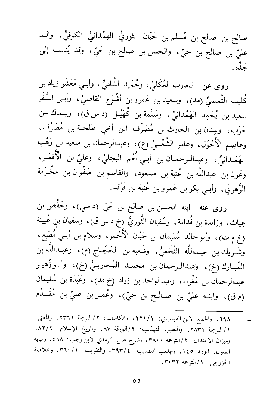 = 298، والجمع لابن القيسراني: 1 / 221، والكاشف: 2 / الترجمة 2361، والمغني: 1 / الترجمة 2831، وتذهيب التهذيب: 2 / الورقة 87، وتاريخ الاسلام: 6 / 82، وميزان الاعتدال: 2 / الترجمة 3800، وشرح علل التمرمذي لابن رجب: 468، ونهاية السول، الورقة 145، وتهذيب التهذيب: 4 / 393، والتقريب: 1 / 360، وخلاصة الخزرجي: 1 / الترجمة 3032.