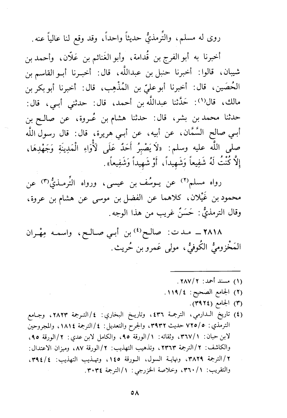 أَخْبَرَنَا به أَبُو الفرج بْنُ قُدَامَةَ، وأَبُو الْغَنَائِمِ بْنُ عَلانَ، وأَحْمَدُ بْنُ شَيْبَانَ، قَالُوا: أَخْبَرَنَا حنبل بْن عَبد الله، قال: أَخْبَرَنَا أبو القاسم بْن الحصين، قال: أَخْبَرَنَا أبو علي بْن المذهب، قال: أَخْبَرَنَا أبو بكر بْن مالك، قال (1) : حَدَّثَنَا عَبد اللَّهِ بْن أَحْمَدَ، قال: حَدَّثني أَبِي، قال: حَدَّثَنَا مُحَمَّدُ بْنُ بِشْرٍ، قال: حَدَّثَنَا هِشَامُ بن عروة، عن صالح بن أَبي صَالِحٍ السَّمَّانِ، عَن أَبِيهِ، عَن أَبِي هُرَيْرة، قال: قال رَسُول اللَّهِ صلى الله عليه وسَلَّمَ: لا يَصْبِرُ أَحَدٌ عَلَى لأْوَاءِ الْمَدِينَةِ وجَهْدِهَا، إِلا كُنْتُ لَهُ شَفِيعًا وشَهِيدًا، أَوْ شَهِيدًا وشَفِيعًا.
