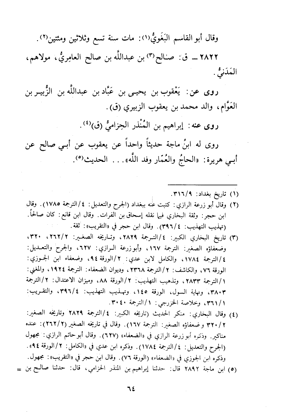 (5) ابن ماجة 2892 قال: حَدَّثَنَا إبراهيم بن المنذر الحزامي، قال: حَدَّثَنَا صالح بن =