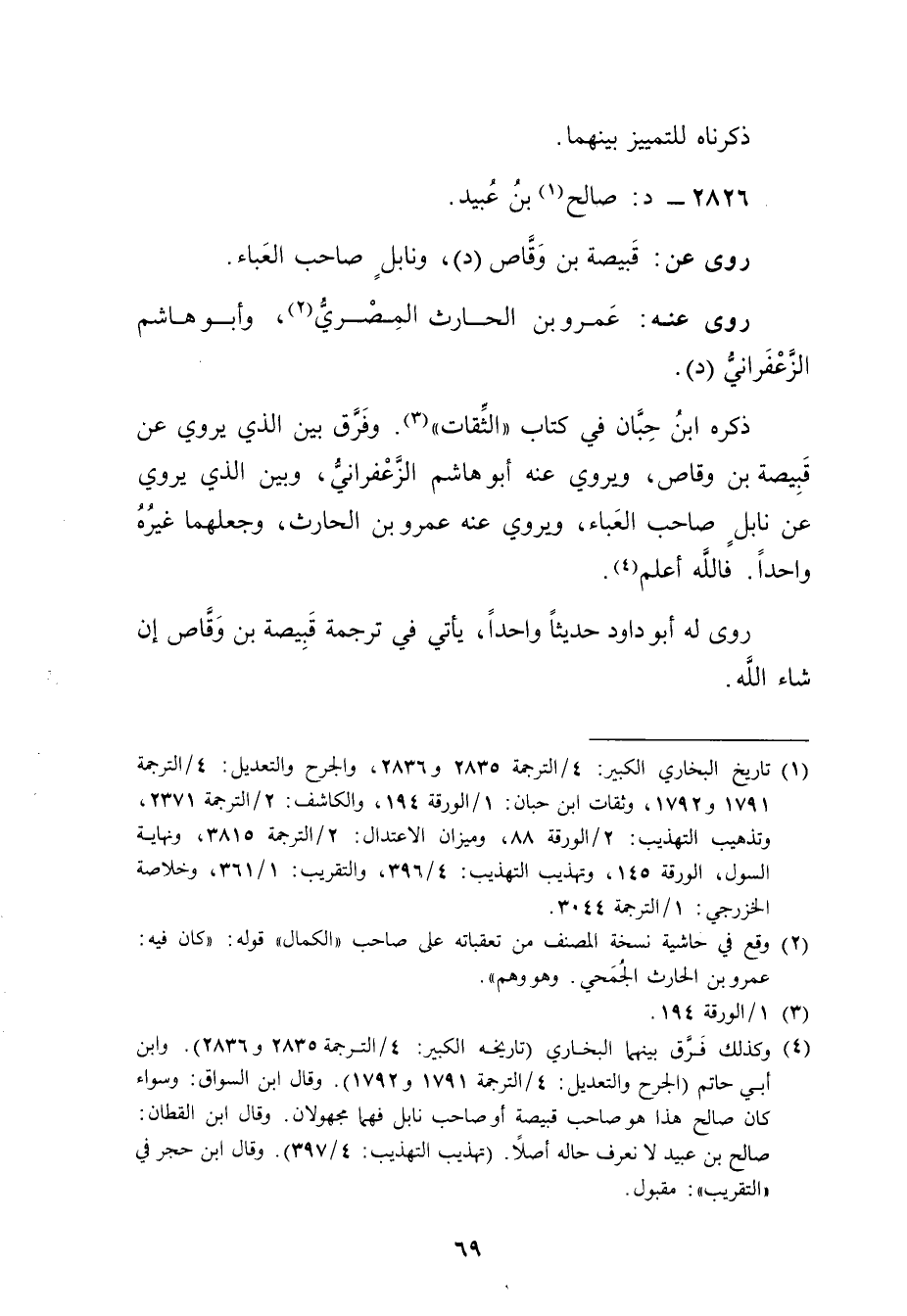 (4) وكذلك فرق بينهما البخاري (تاريخه الكبير: 4 / الترجمة 2835 و2836) . وابن أَبي حاتم (الجرح والتعديل: 4 / الترجمة 1791 و1792) . وَقَال ابن السواق: وسواء كان صالح هذا هو صاحب قبيصة أو صاحب نابل فهما مجهولان. وَقَال ابن القطان: صالح بن عُبَيد لا نعرف حاله أصلا. (تهذيب التهذيب: 4 / 397) . وَقَال ابن حجر في "التقريب": مقبول.