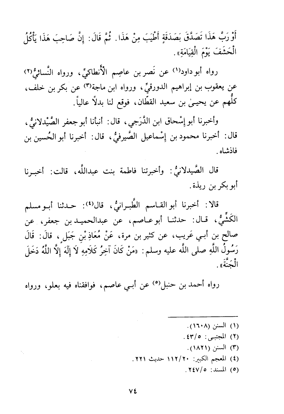 رواه أَبُو دَاوُد (1) عَنْ نَصْرِ بْنِ عَاصِمٍ الأَنْطَاكِيِّ، ورواه النَّسَائي (2) عَنْ يعقوب بْن إِبْرَاهِيمَ الدَّوْرَقِيِّ، ورَوَاهُ ابْنُ مَاجَهْ (3) عَنْ بَكْرِ بْنِ خَلَفٍ، كُلُّهُمْ عَن يحيى بْن سَعِيد القطان، فوقع لنا بدلا عاليا.