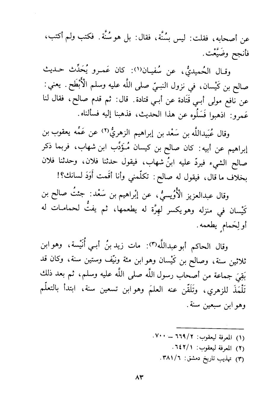 وَقَال عُبَيد الله بن سَعْد بْن إِبْرَاهِيم الزُّهْرِيّ (2) عَنْ عمه يعقوب بن إبراهيم عَن أبيه: كان صالح بن كيسان مؤدب ابن شهاب، فربما ذكر صالح الشئ فيرد عليه ابن شهاب، فيقول حَدَّثَنَا فلان، وحَدَّثَنَا فلان بخلاف ما قال، فيقول له صالح: تكلمني وأنا أقمت أود لسانك؟ ! وَقَال عبد العزيز الأُوَيسي، عن إبراهيم بن سعد: جئت صالح بن كيسان في منزله وهو يكسر لهرة له يطعمها، ثم يفت لحمامات له أو لحمام يطعمه.