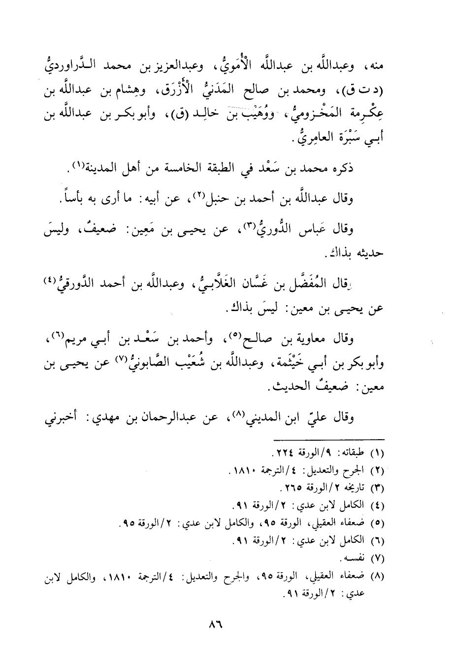 (8) ضعفاء العقيلي، الورقة 95، والجرح والتعديل: 4 / الترجمة 1810، والكامل لابن عدي: 2 / الورقة 91.