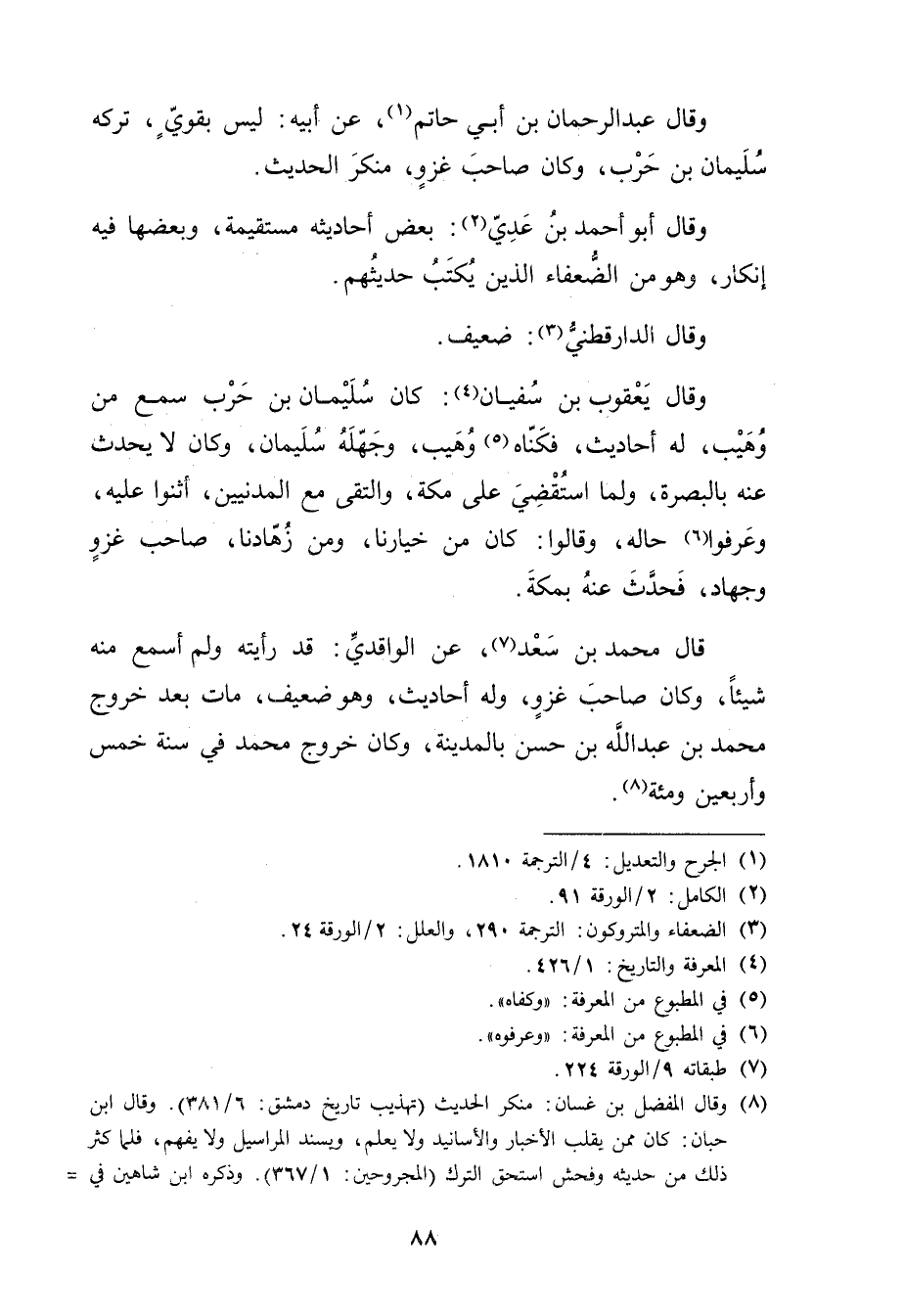 (8) وَقَال المفضل بن غسان: منكر الحديث (تهذيب تاريخ دمشق: 6 / 381) . وَقَال ابْن حبان: كان ممن يقلب الاخبار والأسانيد ولا يعلم، ويسند المراسيل ولا يفهم، فلما كثر ذلك من حديثه وفحش استحق الترك (المجروحين: 1 / 367) ، وذَكَره ابن شاهين في =