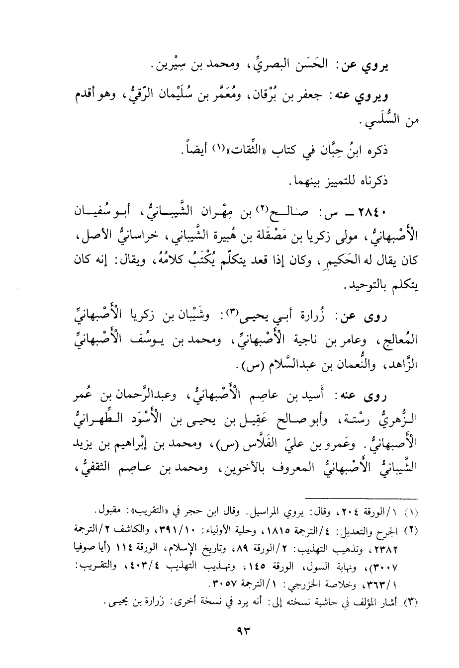 2840 - س: صالح بن مهران الشيباني (2) ، أبو سفيان الأصبهاني، مولى زكريا بن مصقلة بن هبيرة الشيباني، خراساني الأصل، كان يقال له الحكيم، وكان إذا قعد يتكلم يكتب كلامه، ويُقال: إنه كان يتكلم بالتوحيد.