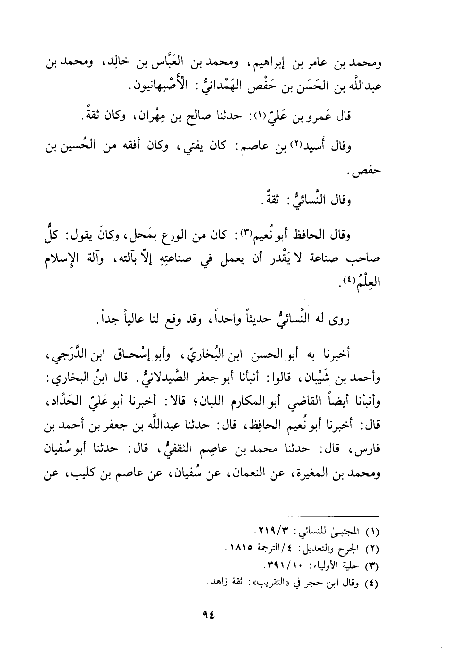 أَخْبَرَنَا بِهِ أَبُو الحسن بْن البخاري، وأبو إِسْحَاقَ ابْنُ الدَّرَجِيِّ، وأَحْمَدُ بْنُ شَيْبَانَ، قَالُوا: أَنْبَأَنَا أَبُو جَعْفَرٍ الصيدلاني. قال ابن البخاري: وأَنَبَأَنَا أَيْضًا الْقَاضِي أَبو الْمَكَارِمِ اللَّبَّانُ ; قالا: أَخْبَرَنَا أَبُو علي الحداد، قال: أَخْبَرَنَا أَبُو نُعَيْمٍ الْحَافِظُ، قال: حَدَّثَنَا عَبد اللَّهِ بْن جَعْفَر بْن أَحْمَد بْن فارس، قال: حَدَّثَنَا مُحَمَّدُ بْنُ عَاصِمٍ الثَّقَفِيُّ، قال: حَدَّثَنَا أَبُو سُفْيَانَ ومُحَمَّدُ بْنُ الْمُغِيرَةِ، عَنِ النُّعْمَانِ، عَنْ سُفْيَانَ، عَنْ عَاصِمِ بْنِ كليب، عن