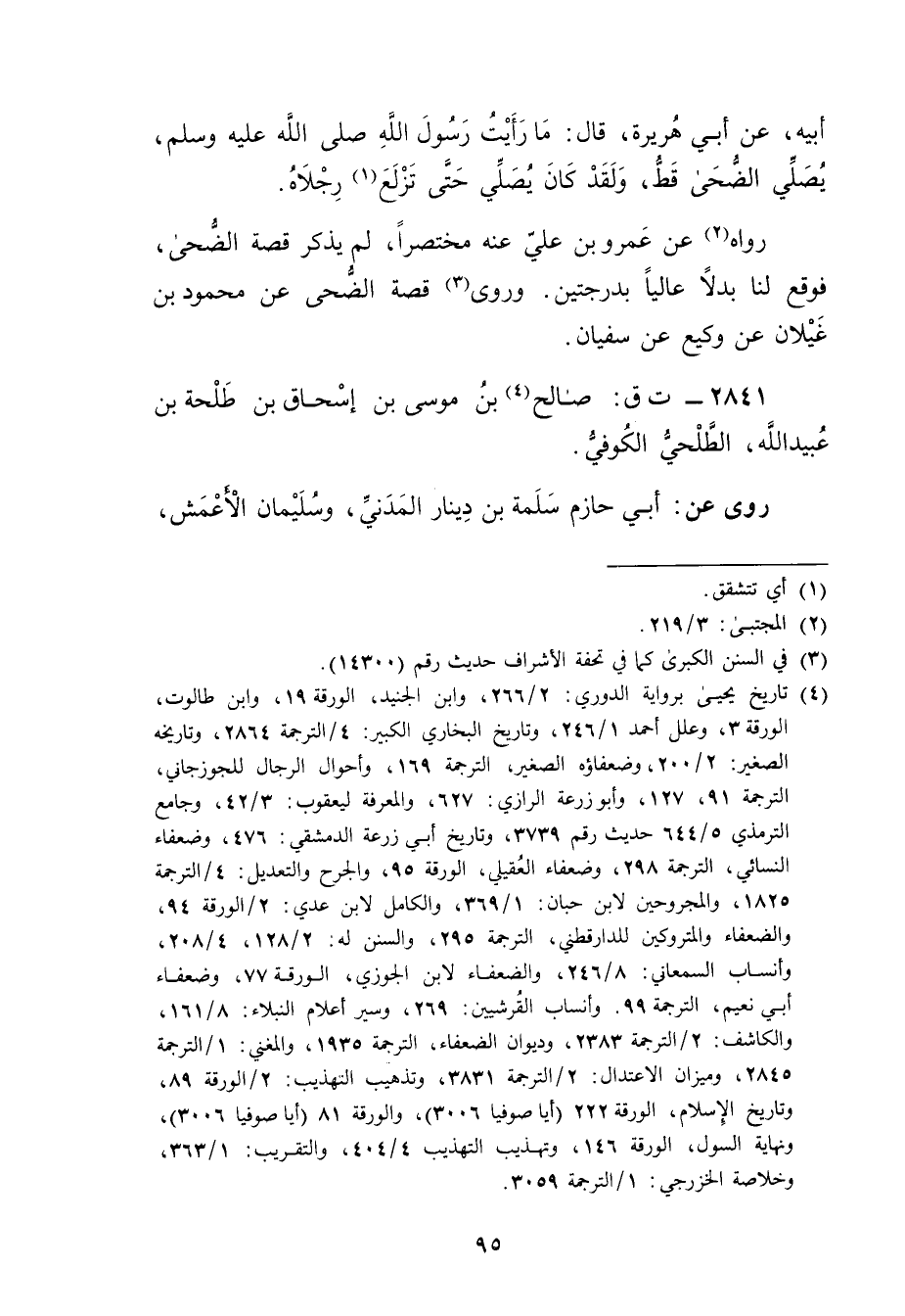 أَبِيهِ، عَن أَبِي هُرَيْرة، قال: مَا رَأَيْتُ رَسُولَ اللَّهِ صَلَّى اللَّهُ عَلَيْهِ وسَلَّمَ، يُصَلِّي الضُّحَى قَطُّ، ولَقَدْ كَانَ يُصَلِّي حَتَّى تَزْلَعَ (1) رِجْلاهُ.