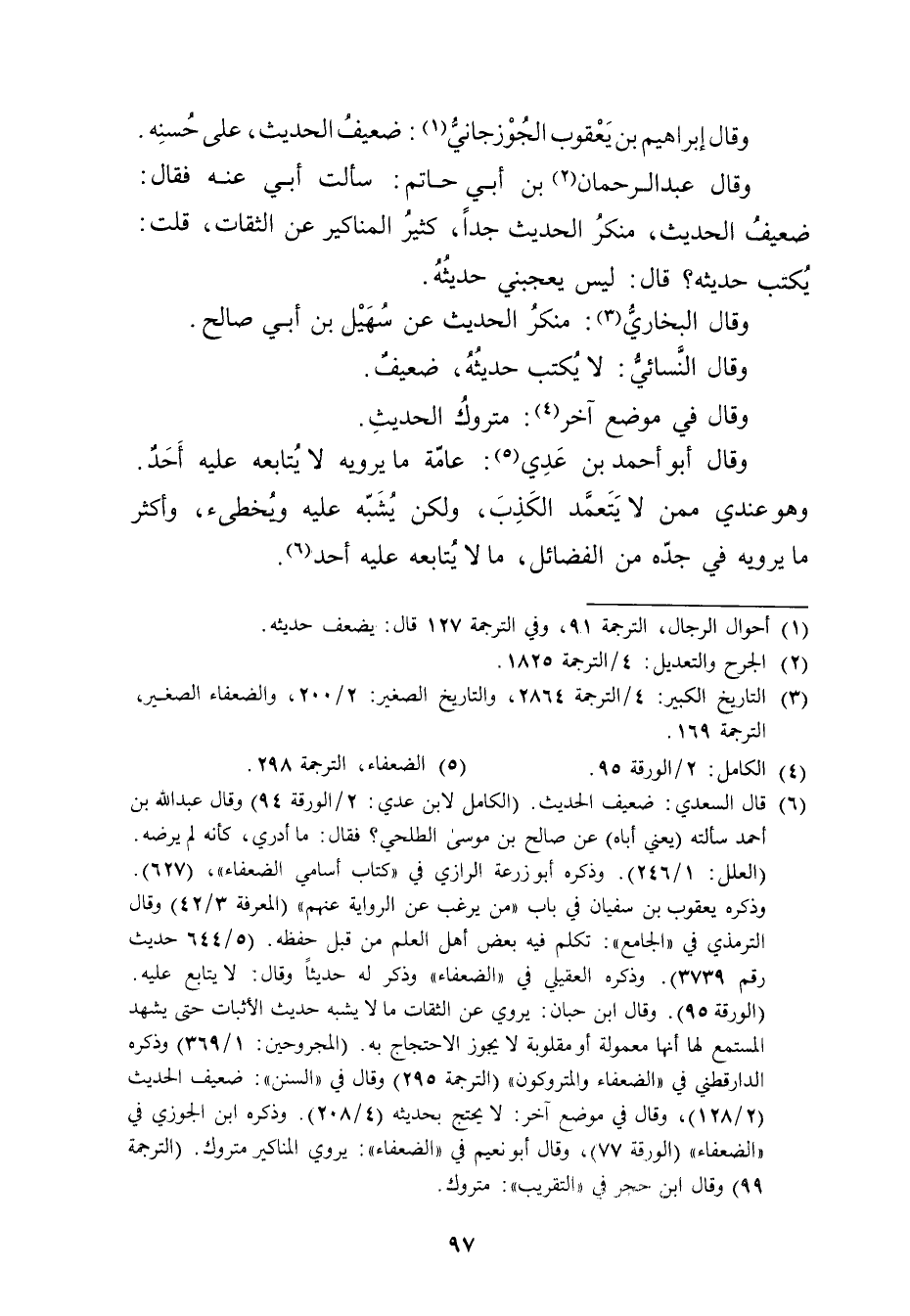 (1) أحوال الرجال، الترجمة 91، وفي الترجمة 127 قال: يضعف حديثه.