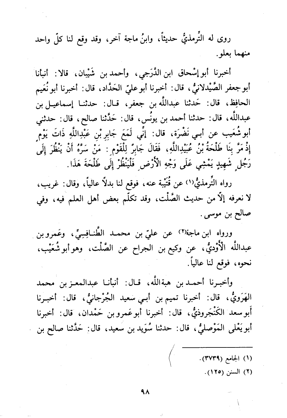 أَخْبَرَنَا أَبُو إِسْحَاقَ ابْنُ الدَّرَجِيِّ، وأَحْمَدُ بْنُ شَيْبَانَ، قَالا: أَنْبَأَنَا أَبُو جَعْفَرٍ الصَّيْدَلانِيُّ، قال: أَخْبَرَنَا أَبُو عَلِيّ الحداد، قال: أَخْبَرَنَا أَبُو نُعَيْمٍ الْحَافِظُ، قال: حَدَّثَنَا عَبد اللَّهِ بْن جَعْفَرٍ، قال: حَدَّثَنَا إِسْمَاعِيلُ بْنُ عَبد اللَّهِ، قال: حَدَّثَنَا أَحْمَدُ بْنُ يُونُسَ، قال: حَدَّثَنَا صَالِحٌ، قال: حَدَّثَنِي أَبُو شُعَيْبٍ عَن أَبِي نَضْرَةَ، قال: إِنِّي لَمَعَ جَابِرِ بْنِ عَبد اللَّهِ ذَاتَ يَوْمٍ إِذْ مَرَّ بِنَا طَلْحَةُ بْنُ عُبَيد اللَّهِ، فَقَالَ جَابِرٌ لِلْقَوْمِ: مَنْ سَرَّهُ أَنْ يَنْظُرَ إِلَى رَجُلٍ شَهِيدٍ يَمْشِي عَلَى وجْهِ الأَرْضِ فَلْيَنْظُرْ إِلَى طَلْحَةَ هَذَا.