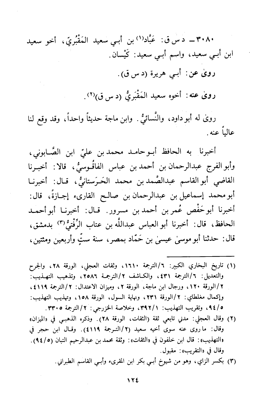3080 - د س ق: عباد بن أَبي سَعِيد الْمَقْبُرِي (1) ، أَخُو سَعِيد ابن أَبي سَعِيد، واسم أبي سَعِيد: كيسان.