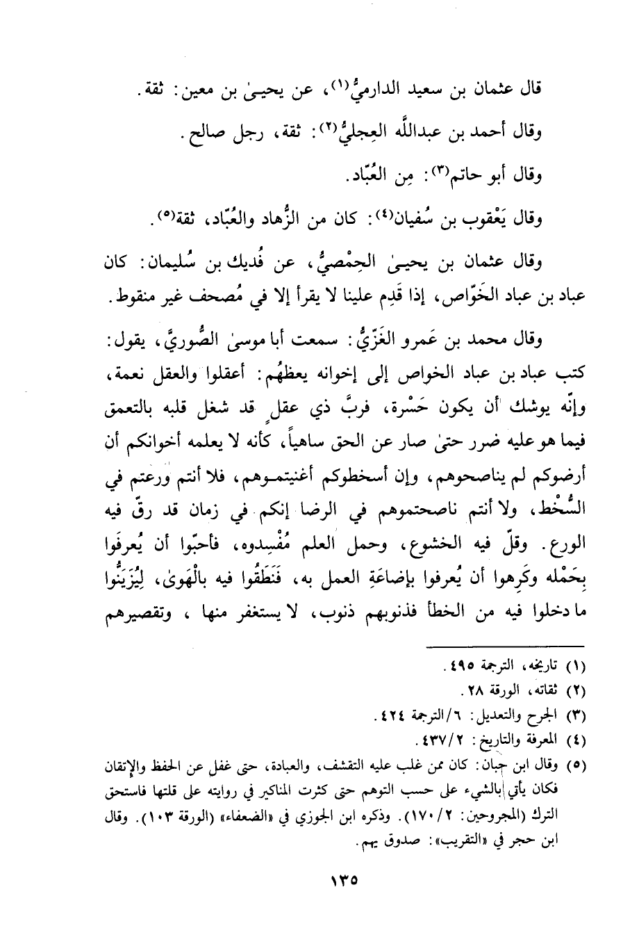 وَقَال مُحَمَّد بْن عَمْرو الغزي: سمعت أبا موسى الصوري، يَقُول: كتب عباد بْن عباد الخواص إلى إخوانه يعظهم: أعقلوا والعقل نعمة، وإنه يوشك أَن يَكُون حسرة، فرب ذي عقل قَدْ شغل قلبه بالتعمق فيما هُوَ عَلَيْهِ ضرر حَتَّى صار عَنِ الحق ساهيا، كَأَنَّهُ لا يعلمه أخوانكم أَن أرضوكم لم يناصحوهم، وإن أسخطوكم أغنيتموهم، فلا أنتم ورعتم فِي السخط، ولا أنتم ناصحتموهم فِي الرضا إنكم فِي زمان قَدْ رق فِيهِ الورع. وقل فِيهِ الخشوع، وحمل العلم مفسدوه، فأحبوا أَن يعرفوا بحمله وكرهوا أَن يعرفوا بإضاعة العمل بِهِ، فنطقوا فِيهِ بالهوى، ليزينوا مَا دخلوا فِيهِ من الخطأ فذنوبهم ذنوب، لا يستغفر منها، وتقصيرهم