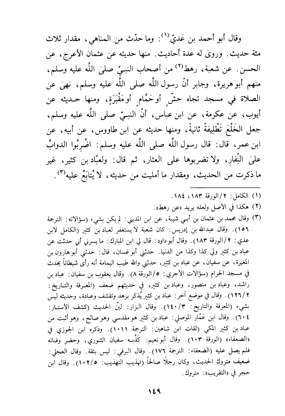 وَقَال أَبُو أَحْمَد بْن عَدِيّ (1) : ومَا حدث من المناهي، مقدار ثلاث مئة حَدِيث. ورَوَى لَهُ عدة أحاديث. منها حَدِيثُهُ عَنْ عُثْمَانَ الأَعْرَجِ، عن الحسن. عن شعبة، رَهْطٍ (2) مِنْ أَصْحَابِ النَّبِيِّ صَلَّى اللَّهُ عَلَيْهِ وسَلَّمَ، منهم أَبُو هُرَيْرة، وجَابِرٌ أَنَّ رَسُولَّ اللَّهِ صَلَّى اللَّهُ عَلَيْهِ وسَلَّمَ، نهى عَنِ الصَّلاةِ فِي مَسْجِدٍ تِجَاهَ حَشٍّ أَوْ حَمَّامٍ أَوْ مَقْبَرَةٍ، ومِنْهَا حَدِيثُهُ عَنْ أَيُّوبَ، عَنْ عِكْرِمَةَ، عن ابْنِ عَبَّاسٍ، أَنَّ النَّبِيُّ صلى الله عليه وسلم، جعل الخلع تطليفة ثَانِيَةً، ومِنْهَا حَدِيثُهُ عَنِ ابْنِ طاووس، عَن أبيه، عَن ابن عُمَر، قال: قال رَسُولُ اللَّهِ صلى اللَّهُ عَلَيْهِ وسَلَّمَ: اضْرِبُوا الدَّوَابَ عَلَى النِّفَارِ، ولا تَضْرِبُوهَا عَلَى الْعِثَارِ، ثُمَّ قال: ولعباد بْن كثير، غَيْر مَا ذكرت من الْحَدِيث، ومقدار مَا أمليت من حديثه، لا يتابع عليه (3) .