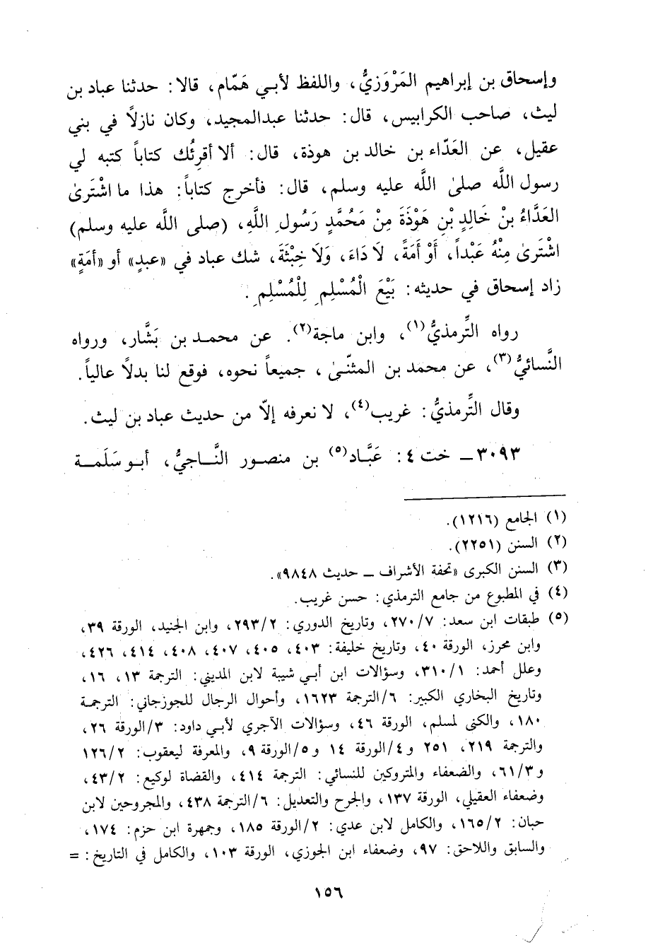 وإِسْحَاقُ بْنُ إِبْرَاهِيمَ الْمَرْوَزِيُّ، واللَّفْظُ لأَبِي هَمَّامٍ، قَالا: حَدَّثَنَا عَبَّادُ بْنُ لَيْثٍ، صَاحِبِ الْكَرَابِيسِ، قال: حَدَّثَنَا عَبد الْمَجِيدِ، وكَانَ نَازِلا فِي بَنِي عَقِيلٍ، عَنِ الْعَدَاءِ بْنِ خَالِدِ بْنِ هَوْذَةَ، قال: أَلا أُقْرِئُكَ كِتَابًا كَتَبَهُ لِي رَسُول اللَّهِ صلى الله عليه وسَلَّمَ، قال: فَأَخْرَجَ كِتَابًا: هَذَا مَا اشْتَرَى الْعَدَّاءُ بْنُ خَالِدِ بْنِ هَوْذَةَ مِنْ مُحَمَّدٍ رَسُولِ اللَّهِ، (صلى الله عليه وسلم) اشْتَرَى مِنْهُ عَبْدًا، أَوْ أَمَةً، لا دَاءَ، ولا خِبْثَةَ، شك عباد فِي "عَبْد"أَوْ"أمة"زاد إِسْحَاق فِي حَدِيثه: بيع المسلم للمسلم.