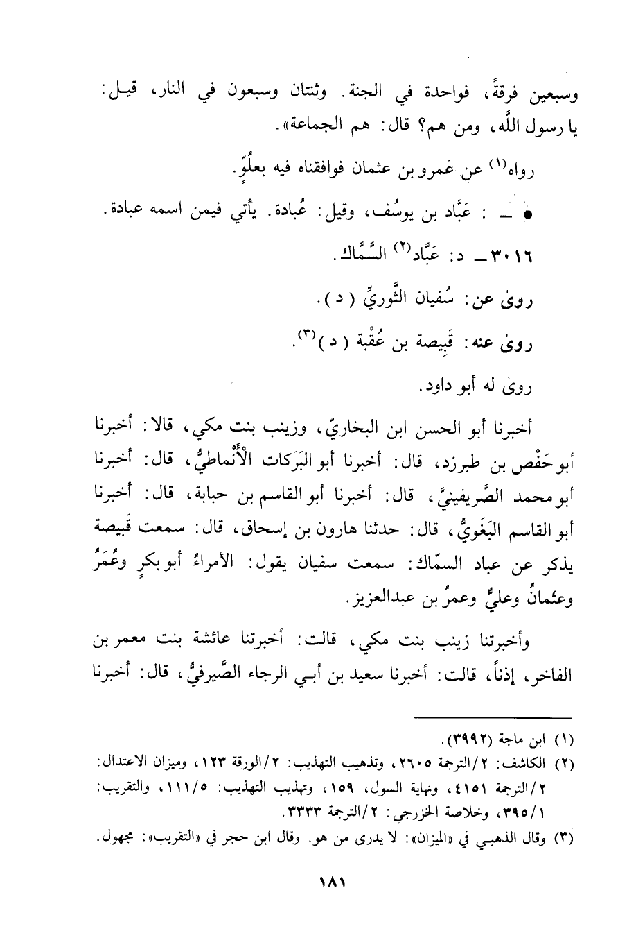 أَخْبَرَنَا أَبُو الحسن بْن البخاري، وزينب بنت مكي، قَالا: أخبرنا أَبُو حفص بن طَبَرْزَذَ، قال: أَخْبَرَنَا أَبُو الْبَرَكَاتِ الأَنْمَاطِيُّ، قال: أخبرنا أَبُو مُحَمَّدٍ الصَّرِيفِينِيُّ، قال: أَخْبَرَنَا أبو القاسم بْن حبابة، قال: أخبرنا أَبُو القاسم الْبَغَوِيُّ، قال: حَدَّثَنَا هَارُونُ بْنُ إِسْحَاق، قال: سمعت قَبِيصَة يذكر عَنْ عباد السماك: سمعت سُفْيَان يَقُول: الأمراء أَبُو بَكْر وعُمَر وعثمان وعلي وعُمَر بْن عَبْد العزيز.
