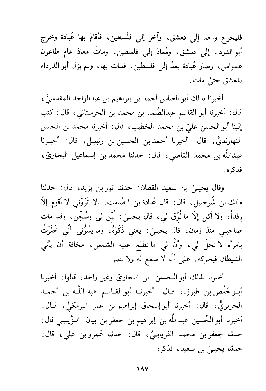وَقَال يَحْيَى بْن سَعِيد الْقَطَّان: حَدَّثَنَا ثَوْرُ بْنُ يَزِيدَ، قال: حَدَّثَنَا مَالِك بْن شُرَحْبِيل، قال: قال عُبَادَة بْن الصامت: ألا تروني لا أقوم إلا رفدا، ولا آكل إلا مَا لوق لي، قال يَحْيَى: لين لي وسخن، وقَدْ مَاتَ صاحبي منذ زمان، قال يَحْيَى: يَعْنِي ذكره، ومَا يسرني أني خلوت بامرأة لا تحل لي، وأن لي مَا تطلع عَلَيْهِ الشَّمْس، مخافة أَن يَأْتِي الشَّيْطَان فيحركه، عَلَى أَنَّهُ لا سمع لَهُ ولا بصر.