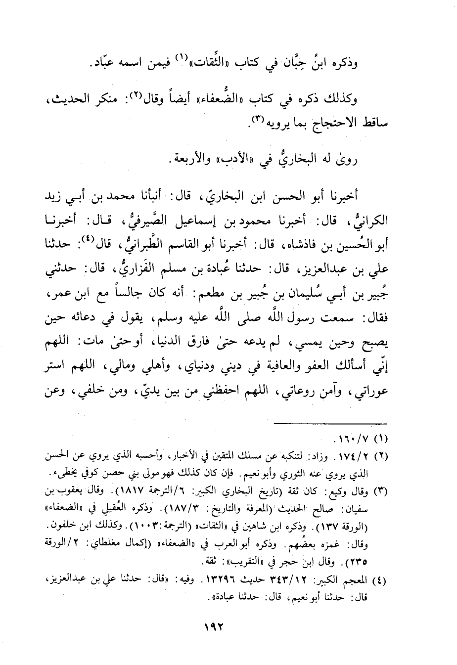 أَخْبَرَنَا أبو الحسن بْن البخاري، قال: أَنْبَأَنَا مُحَمَّدُ بْنُ أَبي زَيْدٍ الْكَرَّانِيُّ، قال: أَخْبَرَنَا مَحْمُودُ بْنُ إِسْمَاعِيلَ الصَّيْرَفِيُّ، قال: أخبرنا أَبُو الْحُسَيْنِ بْنُ فَاذْشَاهِ، قال: أَخْبَرَنَا أَبُو الْقَاسِمِ الطَّبَرَانِيُّ، قال (4) : حَدَّثَنَا عَلِيُّ بْنُ عَبْدِ الْعَزِيزِ، قال حَدَّثَنَا عُبَادَةُ بْنُ مُسْلِمٍ الْفَزَارِيُّ، قال: حَدَّثَنِي جُبَيْرُ بْنُ أَبي سُلَيْمان بْن جبير بْن مطعم: أَنَّهُ كَانَ جَالِسًا مَعَ ابْنِ عُمَر، فَقَالَ: سَمِعْتُ رَسُولَ اللَّهِ صَلَّى اللَّهُ عَلَيْهِ وسَلَّمَ، يقول فِي دُعَائِهِ حِينَ يُصْبِحُ وحِينَ يُمْسِي، لَمْ يَدَعْهُ حَتَّى فَارَقَ الدُّنْيَا، أَوْ حَتَّى مَاتَ: اللَّهُمَّ إِنِّي أَسْأَلُكَ الْعَفْوَ والْعَافِيَةَ فِي دِينِي ودُنْيَايَ، وأَهْلِي ومَالِي، اللَّهُمَّ اسْتُرْ عَوْرَاتِي، وآمِنْ رَوْعَاتِي، اللَّهُمَّ احْفَظْنِي مِنْ بَيْنِ يَدَيَّ، ومِنْ خلفي، وعن