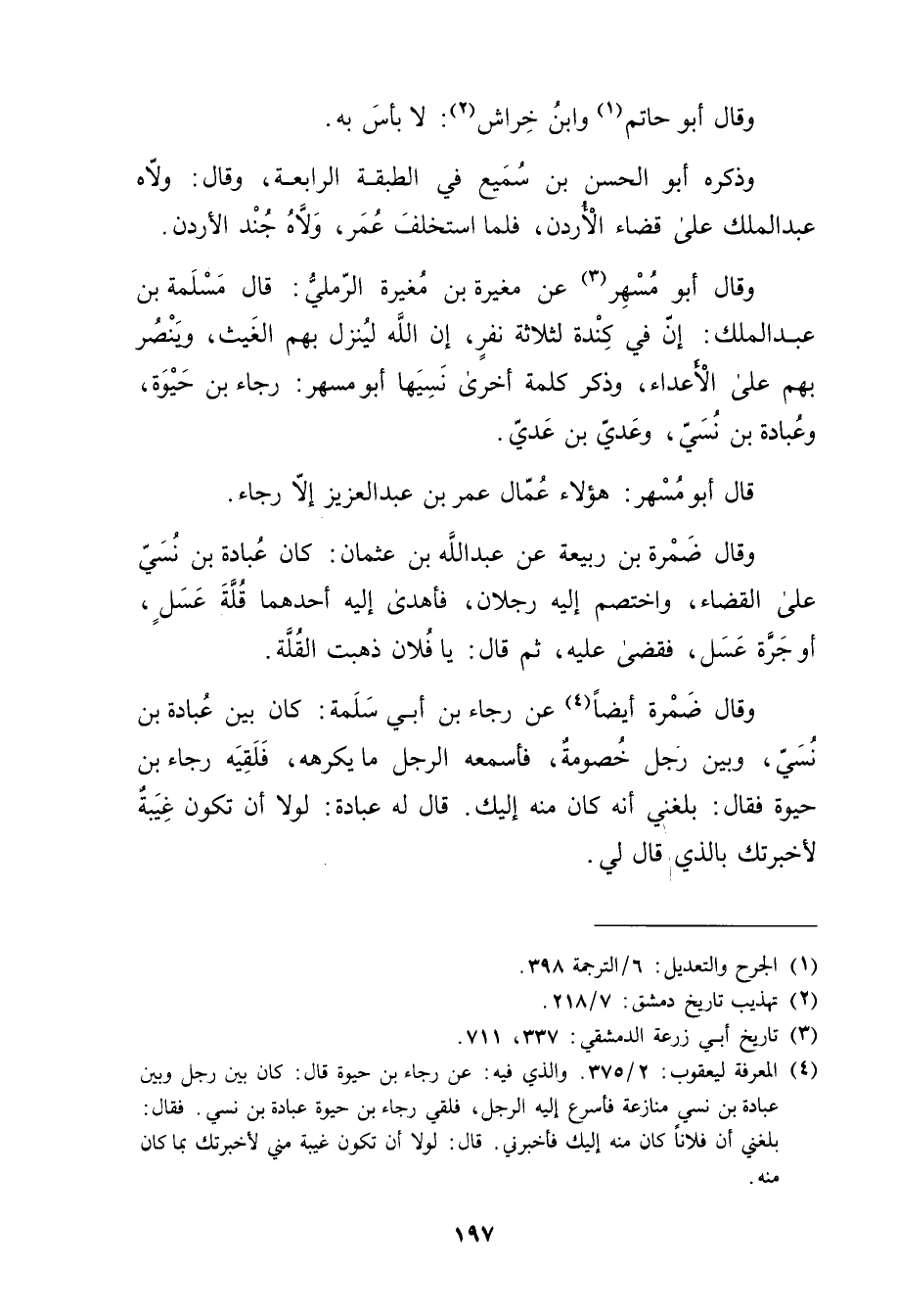 (4) المعرفة ليعقوب: 2 / 375. والذي فيه: عَنْ رجاء بْن حيوة قال: كان بين رجل وبين عبادة بن نسي منازعة فأسرع إليه الرجل، فلقي رجاء بن حيوة عبادة بن نسي. فقال: بلغني أن فلانا كان منه إليك فأخبرني.