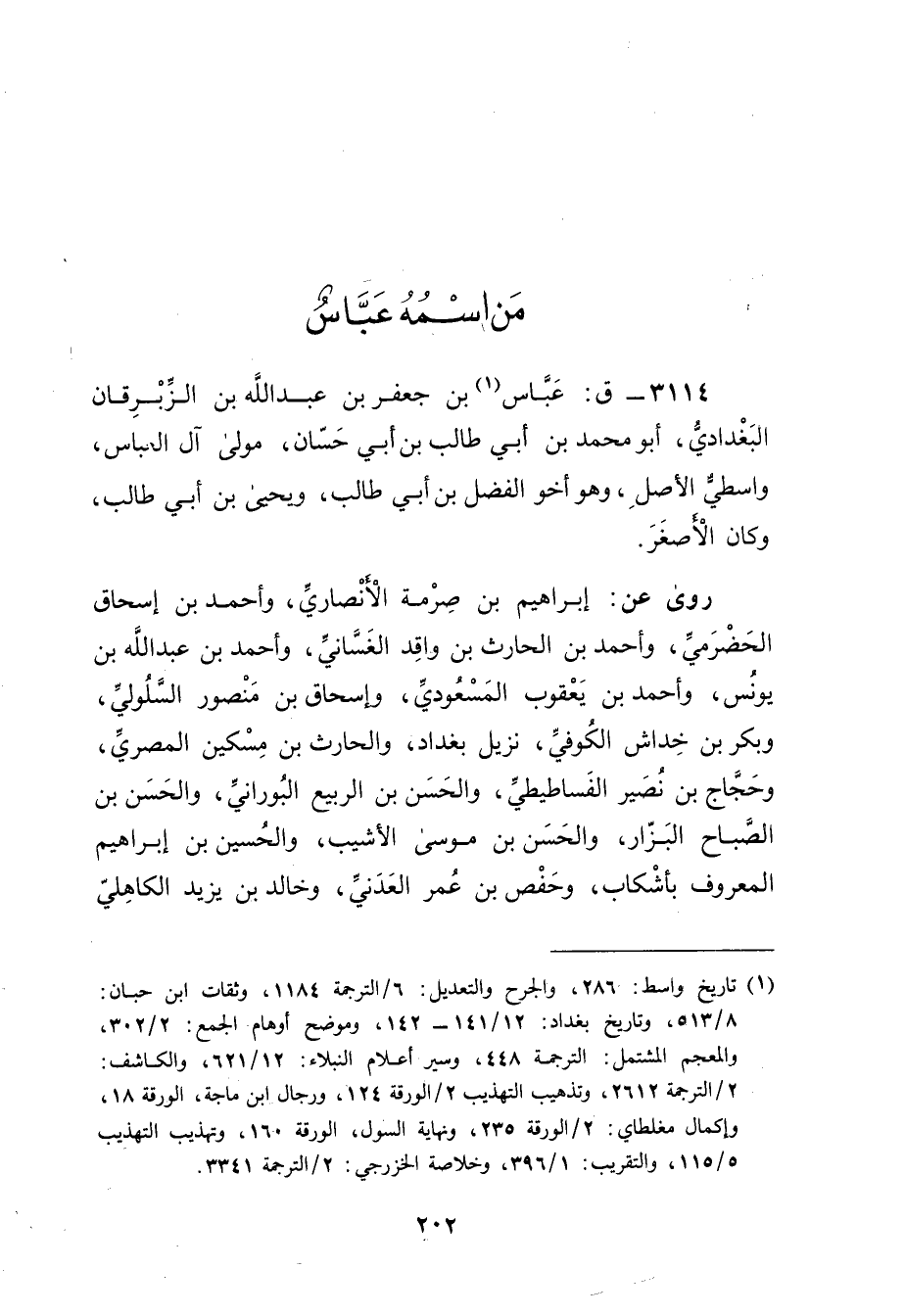 3114 - ق: عَبَّاس بن جعفر بن عَبد اللَّه بن الزبرقان البغدادي (1) ، أَبُو مُحَمَّد بن أَبي طَالِب بن أَبي حسان، مولى آل الْعَبَّاس، واسطي الأصل، وهُوَ أَخُو الفضل بْن أَبي طَالِب، ويَحْيَى بْن أَبي طَالِب، وكَانَ الأصغر.