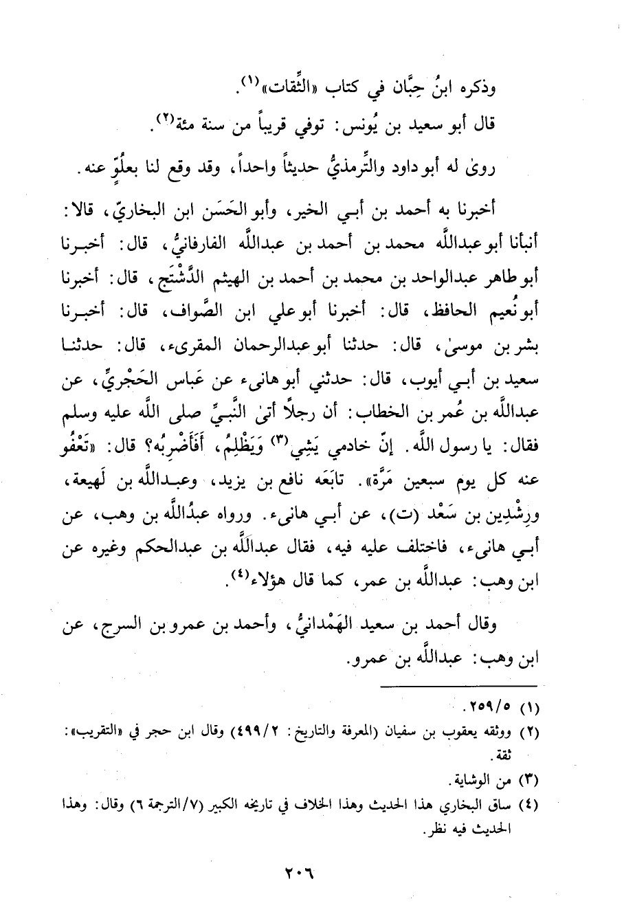 أَخْبَرَنَا بِهِ أَحْمَدُ بْنُ أَبي الْخَيْرِ، وأَبُو الْحَسَنِ بْنُ الْبُخَارِيِّ، قَالا: أَنْبَأَنَا أَبُو عَبْد اللَّهِ مُحَمَّد بْن أَحْمَد بْنِ عَبد اللَّهِ الْفَارَفَانِيُّ، قال: أَخْبَرَنَا أَبُو طَاهِرٍ عَبْدُ الْوَاحِد بْن مُحَمَّد بْن أَحْمَد بْن الْهَيْثَمِ الدشتج، قال: أَخْبَرَنَا أَبُو نُعَيْمٍ الْحَافِظُ، قال: أَخْبَرَنَا أَبُو علي ابن الصُّوَّافِ، قال: أَخْبَرَنَا بِشْرُ بْنُ مُوسَى، قال: حَدَّثَنَا أَبُو عَبْدِ الرحمن المقرئ، قال: حَدَّثَنَا سَعِيد بْنُ أَبي أَيُّوبَ، قال: حَدَّثَنِي أَبُو هَانِئٍ عَنْ عَبَّاسِ الْحَجْرِيِّ، عن عَبد الله بْن عُمَر بْنِ الْخَطَّابِ: أَنَّ رَجُلا أَتَى النَّبِيُّ صلى الله عليه وسلم فَقَالَ: يَا رَسُولَ اللَّهِ. إِنَّ خادمي يشي (3) ويَظْلِمُ، أَفَأَضْرِبُهُ؟ قال: تَعْفُو عَنْهُ كُلَّ يَوْمٍ سَبْعِينَ مَرَّةً". تابعه نَافِع بْن يَزِيد، وعَبد اللَّه بْن لَهِيعَة، ورشدين بْن سَعْد (ت) ، عَن أَبِي هانئ.