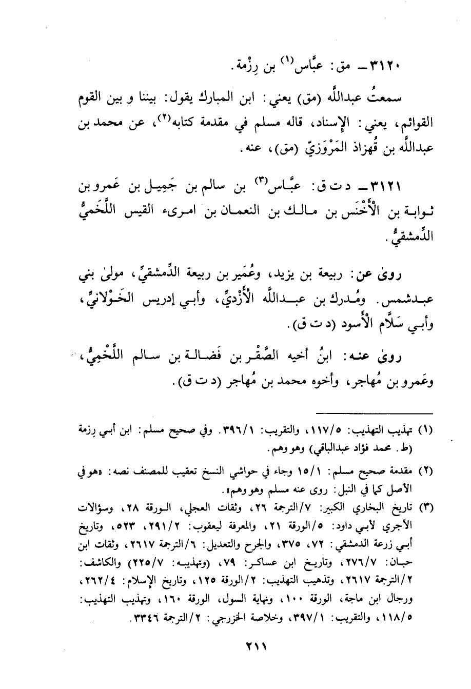 (3) تاريخ البخاري الكبير: 7 / الترجمة 26، وثقات العجلي، الورقة 28، وسؤالات الآجري لابي داود: 5 / الورقة 21، والمعرفة ليعقوب: 2 / 291، 523، وتاريخ أبي زرعة الدمشقي: 72، 375، والجرح والتعديل: 6 / الترجمة 2617، وثقات ابن حبان: 7 / 276، وتاريخ ابن عساكر: 79، (وتهذيبه: 7 / 225) والكاشف: 2 / الترجمة 2617، وتذهيب التهذيب: 2 / الورقة 125، وتاريخ االاسلام: 4 / 262، ورجال ابن ماجة، الورقة 100، ونهاية السول، الورقة 160، وتهذيب التهذيب: 5 / 118، والتقريب: 1 / 397، وخلاصة الخزرجي: 2 / الترجمة 3346.