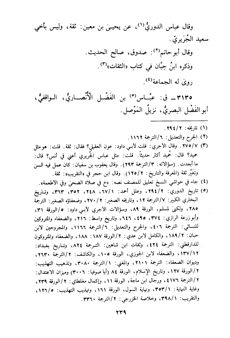 3135 - ق: عَبَّاس بن الفضل الأَنْصارِيّ (5) ، الواقفي، أَبُو الفضل البَصْرِيّ، نزيل الموصل.