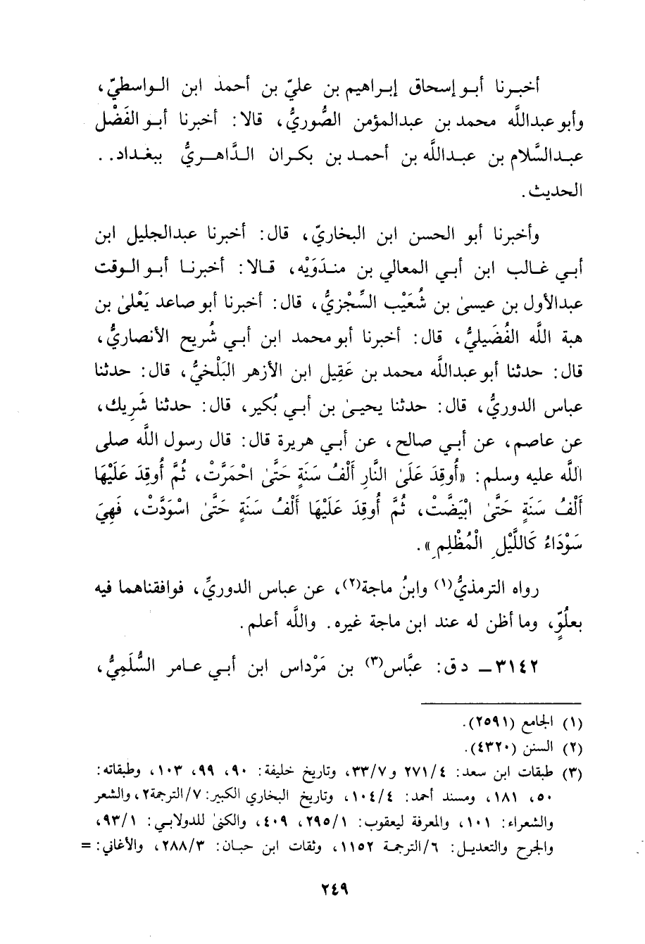 وأَخْبَرَنَا أَبُو الْحَسَنِ بْنُ الْبُخَارِيِّ، قال: أَخْبَرَنَا عَبْدُ الجليل ابن أَبي غالب ابن أَبي الْمَعَالِي بْنِ مَنْدَوَيْهِ، قَالا: أخبرنا أَبُو الْوَقْتِ عَبْدُ الأَوَّلِ بْنُ عِيسَى بْنِ شُعَيْبٍ السِّجْزِيُّ، قال: أَخْبَرَنَا أَبُو صَاعِدٍ يَعْلَى بْنُ هِبَةِ اللَّهِ الْفُضَيْلِيُّ، قال: أخبرنا أبو محمد ابن أَبي شُرَيْحٍ الأَنْصارِيّ، قال: حَدَّثَنَا أَبُو عَبْد اللَّهِ مُحَمَّد بْن عقيل ابن الأَزْهَرِ الْبَلْخِيُّ، قال: حَدَّثَنَا عَبَّاسُ الدُّورِيُّ، قال: حَدَّثَنَا يَحْيَى بْنُ أَبي بُكَيْرٍ، قال: حَدَّثَنَا شَرِيك، عَنْ عَاصِمٍ، عَن أَبِي صَالِحٍ، عَن أَبِي هُرَيْرة قال: قال رَسُول اللَّهِ صلى الله عليه وسَلَّمَ: أُوقِدَ عَلَى النَّارِ أَلْفَ سَنَةٍ حَتَّى احْمَرَّتْ، ثُمَّ أُوقِدَ عَلَيْهَا أَلْفَ سَنَةٍ حَتَّى ابْيَضَّتْ، ثُمَّ أُوقِدَ عَلَيْهَا أَلْفَ سَنَةٍ حَتَّى اسْوَدَّتْ، فَهِيَ سَوْدَاءُ كَاللَّيْلِ الْمُظْلِمِ.