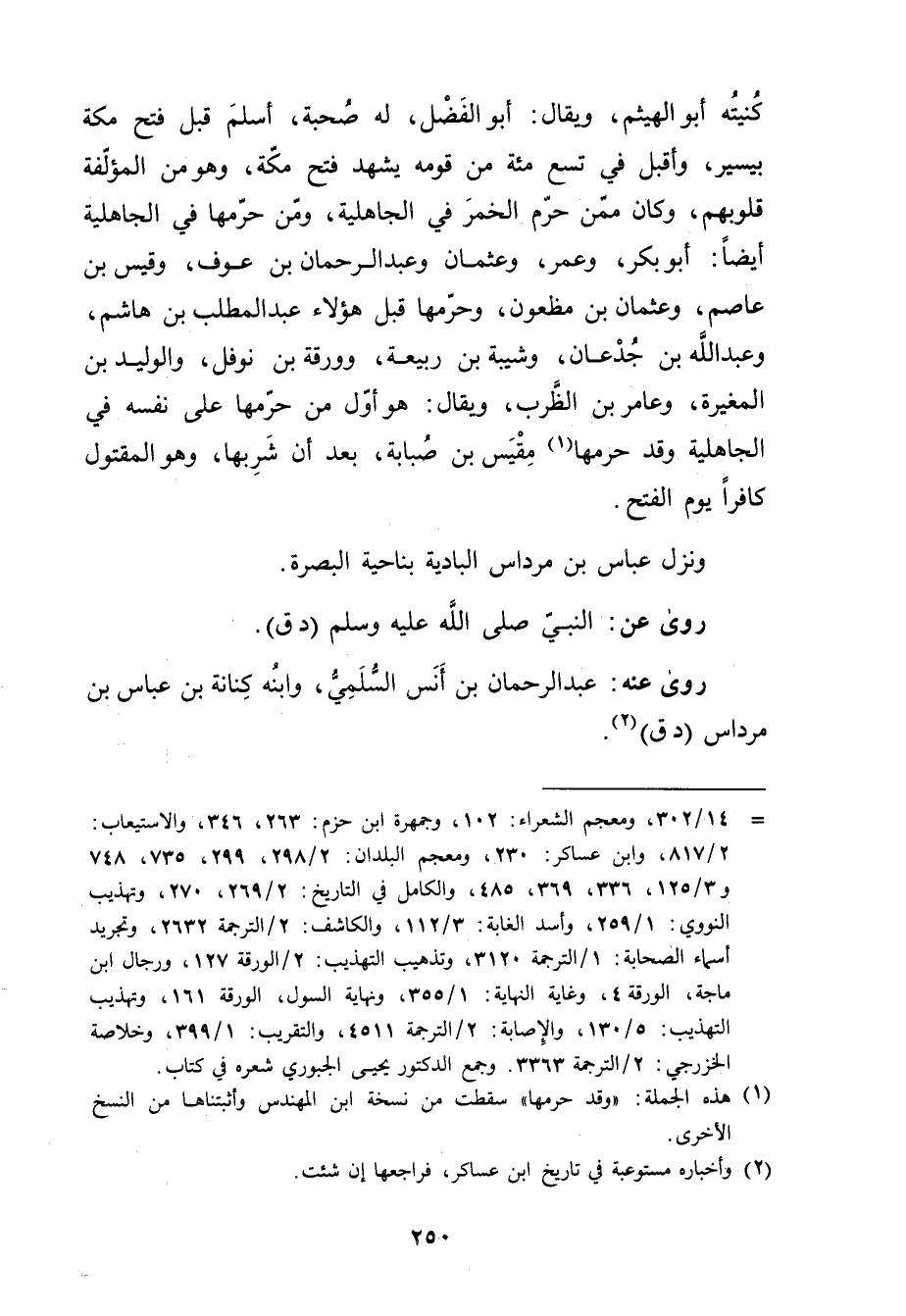 كنيته أَبُو الهيثم، ويُقال: أَبُو الفضل، لهُ صُحبَةٌ، أسلم قبل فتح مَكَّة بيسير، وأقبل فِي تسع مئة من قومه يشهد فتح مَكَّة، وهُوَ من المؤلفة قلوبهم، وكَانَ مِمَّن حرم الخمر فِي الجاهلية، ومن حرمها فِي الجاهلية أَيْضًا: أَبُو بَكْر، وعُمَر، وعثمان وعَبْد الرَّحْمَنِ بْن عوف، وقيس بْن عَاصِم، وعثمان بْن مظعون، وحرمها قبل هؤلاء عبد المطلب بْن هاشم، وعبد اللَّه بْن جدعان، وشَيْبَة بْن ربيعة، وورقة بْن نوفل، والوليد بْن الْمُغِيرَة، وعامر بْن الظرب، ويُقال: هُوَ أول من حرمها عَلَى نَفْسه فِي الجاهلية وقَدْ حرمها (1) مقيس بْن صبابة، بَعْد أَن شربها، وهُوَ المقتول كافرا يَوْم الفتح.