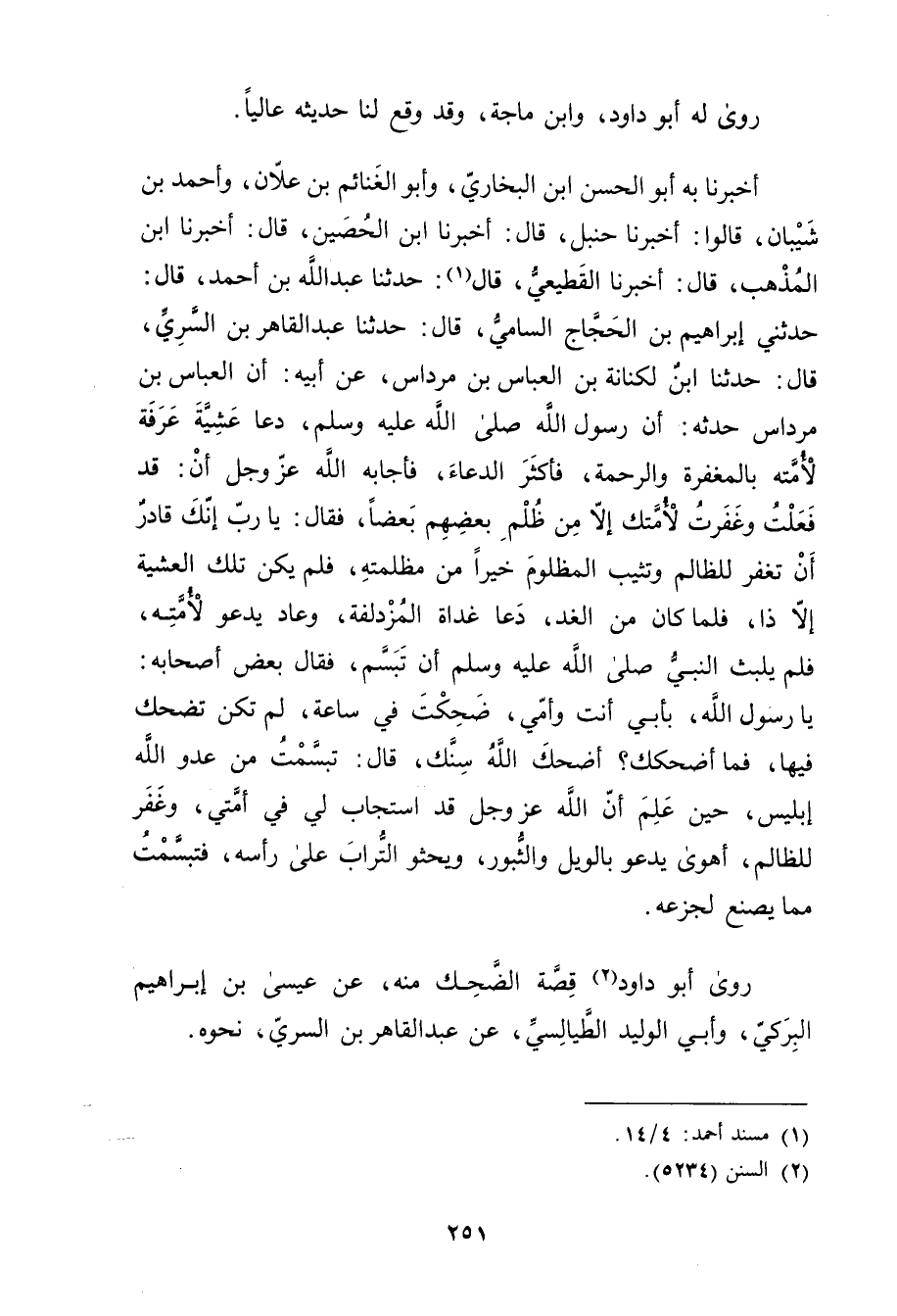 أَخْبَرَنَا بِهِ أَبُو الْحَسَنِ بْنُ الْبُخَارِيِّ، وأَبُو الْغَنَائِمِ بْنُ عَلانَ، وأَحْمَدُ بْنُ شَيْبَانَ، قَالُوا: أخبرنا حنبل، قال: أخبرنا ابن الْحُصَيْنِ، قال: أخبرنا ابْنُ الْمُذْهِب، قال: أخبرنا القَطِيعِيّ، قال (1) : حَدَّثَنَا عَبد اللَّهِ بْن أَحْمَدَ، قال: حَدَّثَنِي إِبْرَاهِيمُ بْنُ الْحَجَّاجِ السَّامِيُّ، قال: حَدَّثَنَا عَبْدُ الْقَاهِرِ بْنُ السَّرِيِّ، قال: حَدَّثَنَا ابْنُ لَكْنَانَةَ بْنِ الْعَبَّاسِ بْنِ مِرْدَاسٍ، عَن أَبِيهِ: أَنَّ الْعَبَّاسَ بْنَ