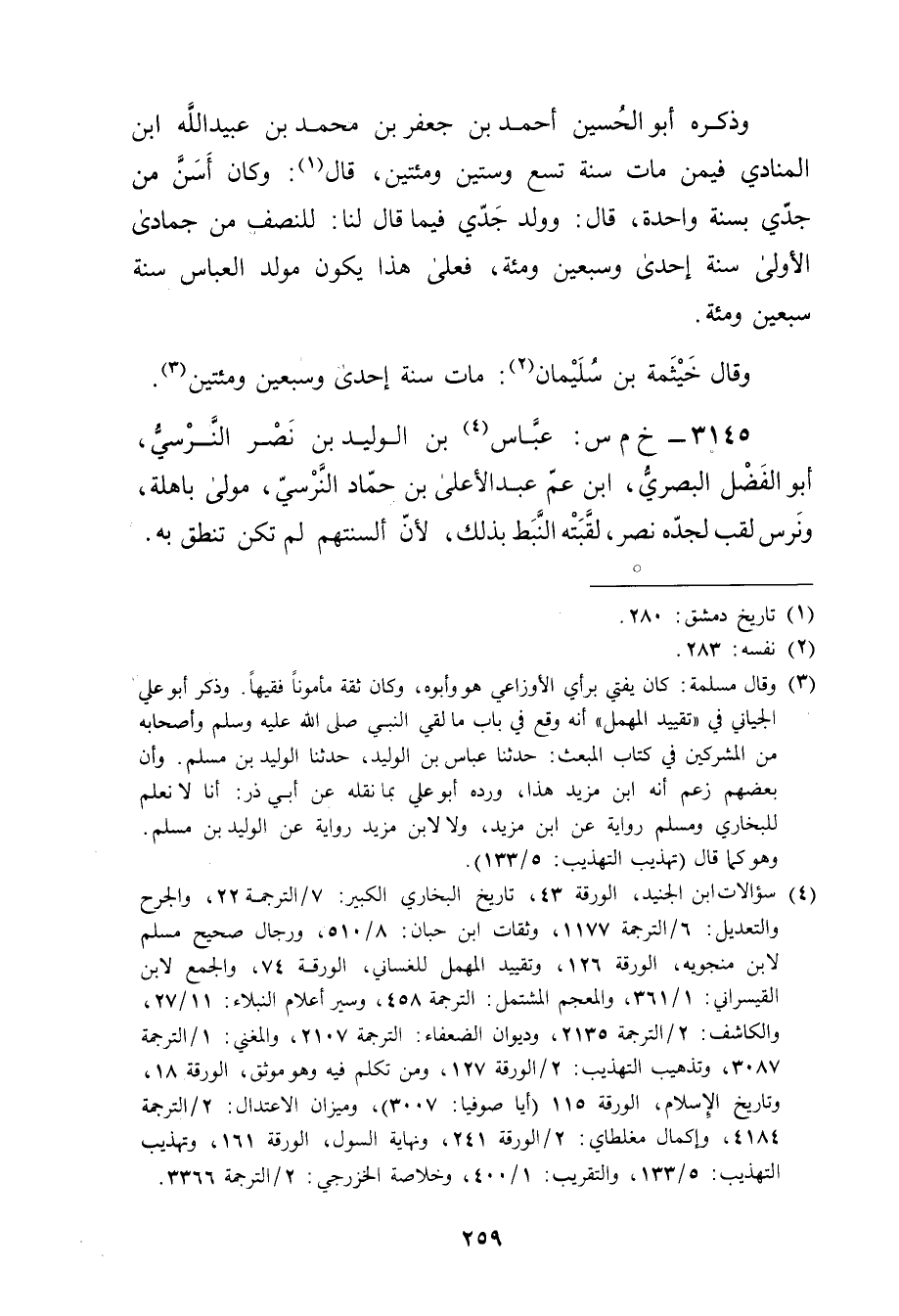 3145 - خ م س: عَبَّاس بن الْوَلِيد بن نصر النرسي (4) ، أَبُو الفضل البَصْرِيّ، ابن عم عبد الاعلى بْن حماد النرسي، مولى باهلة، ونرس لقب لجده نصر، لقبته النبط بِذَلِكَ، لأن ألسنتهم لَمْ تكن تنطق به.